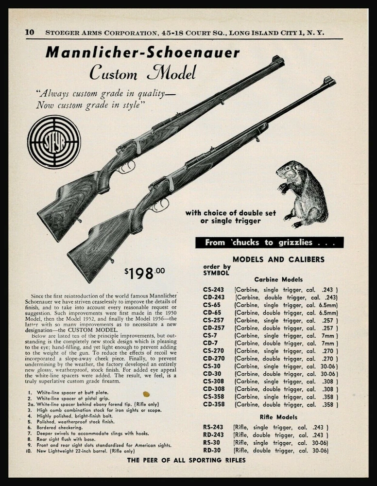 1958 MANNLICHER SCHOENAUER Custom Model Carbine Rifle PRINT AD all model prices