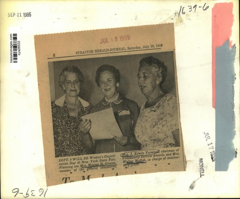 ebay template Note: Please study the images carefully to determine the condition of this vintage photograph, as it may not be in perfect condition. It may contain wrinkles, cracks, and possibly even tears due to its age and how it was handled before it got to us. A scanner may interpret colors and contrast differently than human eyes will, so it is possible that the actual photograph may be slightly darker or lighter in person. This vintage photograph is offered for sale as a collectible item and conveys no transfer of copyright. 1959 Press Photo Women's Organization Day Committee Members - sya26533 This is an original press photo. Sept. 9 Will Be Women's Organization Day at New York State Fair, planning are Mrs. Marion H. Greene, member of the general committee, Mrs. J. Edwin Yarwood, chairman of Community Service Awards, and Mrs. Walter McNab, in charge of anniversary plans. Photo measures 10 x 8.25 inches. Photo is dated 07-18-1959. PHOTO FRONT PHOTO BACK Historic Images Part Number: sya26533 Sell Smarter with Kyozou. Inventory and Ecommerce Management
