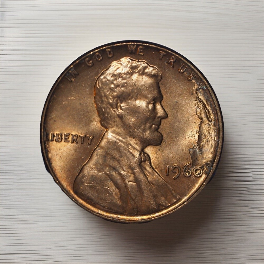 The product is a 1960 Lincoln Memorial Penny that is a business strike with a copper composition. This mint error coin has a nice obverse lamination on the red copper, making it a unique and attractive piece for coin collectors. It was minted in Philadelphia and is a circulated, small cent denomination coin that features the iconic Lincoln Wheat design on the obverse. This error coin from the United States would make a valuable addition to any coin collection, especially for those interested in US error coins. Bar.20.211