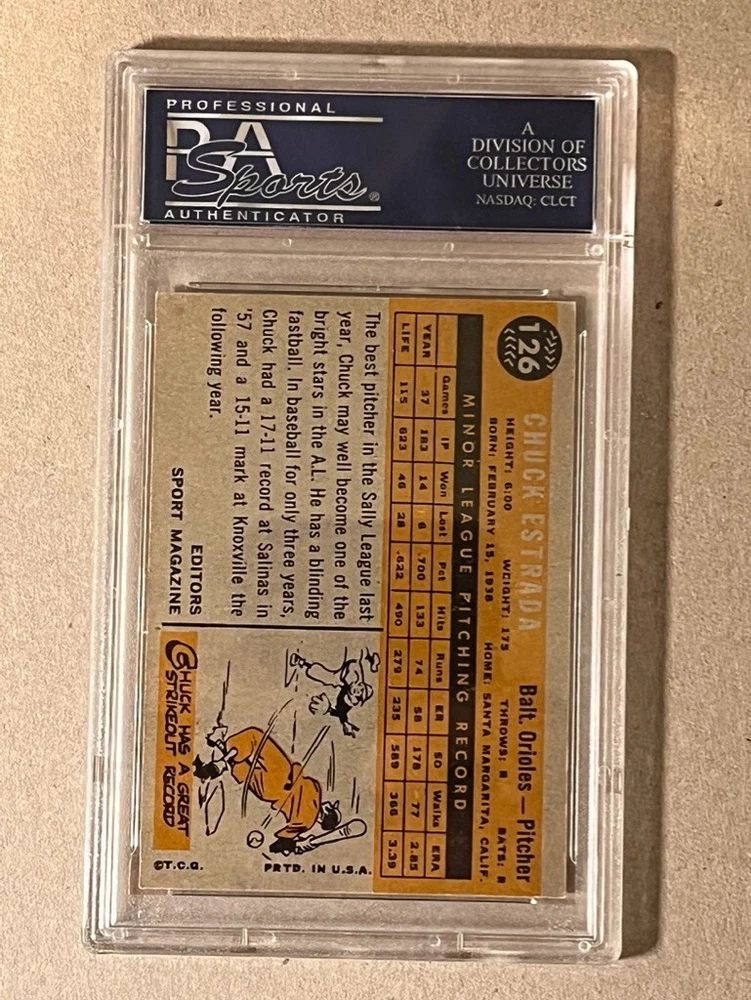 Step back in time with a classic piece of baseball memorabilia, the 1960 Topps #126 Chuck Estrada Rookie Star card. Celebrating the early career of Baltimore Orioles legend Chuck Estrada, this vintage sports trading card is a must-have for collectors and fans alike. With its rich history and iconic design, it's a timeless tribute to the golden era of Major League Baseball. Carefully crafted by Topps, the card features striking imagery and detailed information, capturing the essence of the sport in the 1960s. As a celebrated collectible, this piece not only represents the legacy of a remarkable player but also serves as a tangible connection to the past, making it a standout addition to any collection.