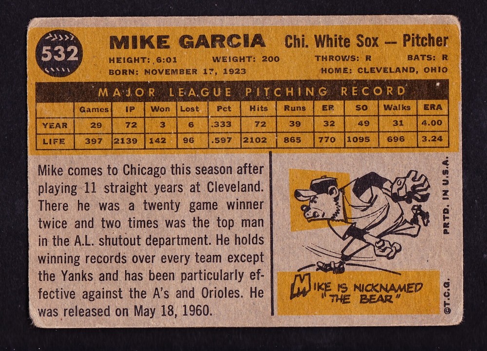 1960 TOPPS #532 MIKE GARCIA WHITE SOX. CARD HAS VERY SMALL VERY LIGHT CREASE. FREE SHIPPING. Inventory #221024-3