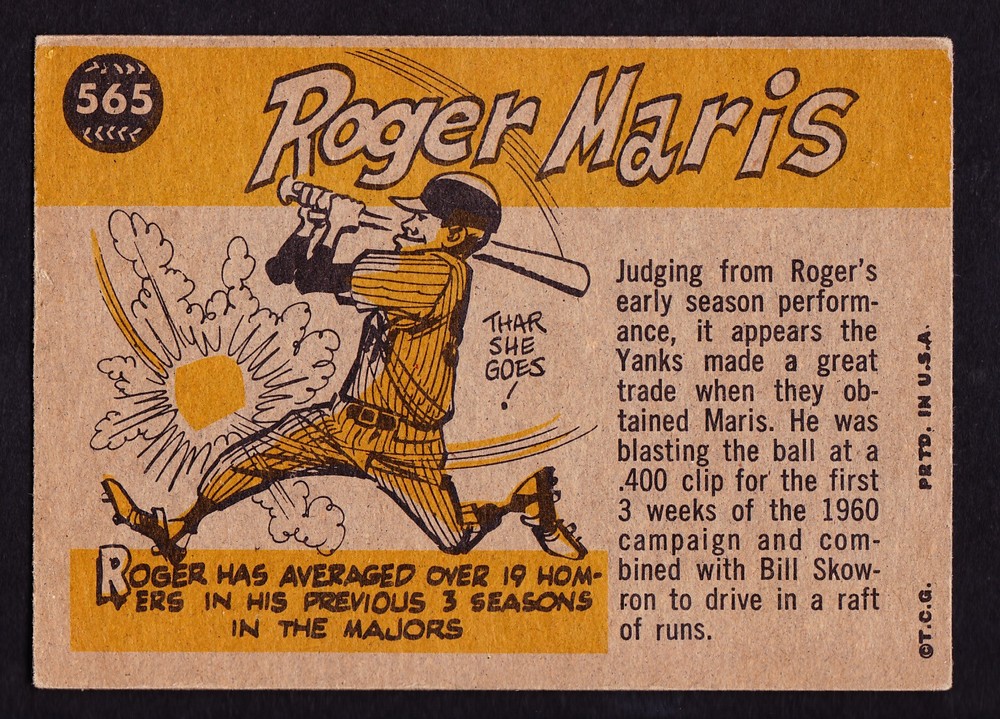 1960 TOPPS #565 ROGER MARIS ALL-STAR. CARD HAS NO CREASE . FREE SHIPPING. Inventory #240722