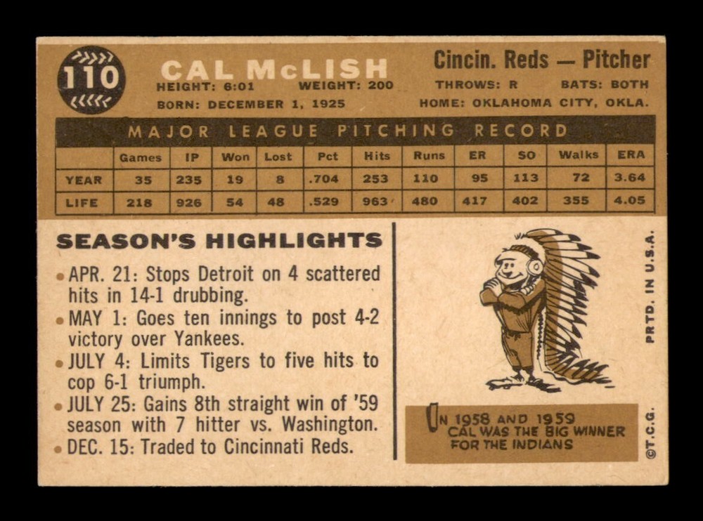 1960 Topps #110 Cal McLish NM Vintage Baseball Card OBGcards Sportscard