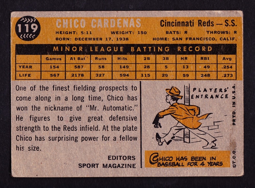1960 TOPPS #119 CHICO CARDENAS REDS ROOKIE. CARD HAS NO CREASE. FREE SHIPPING. Inventory #221024-2