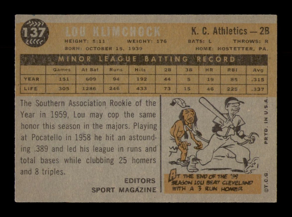 Sport: Baseball Card Manufacturer: Topps Season: 1960 Year: 1960 Series: Varies Original/Reprint: Original Player: Lou Klimchock Graded: No