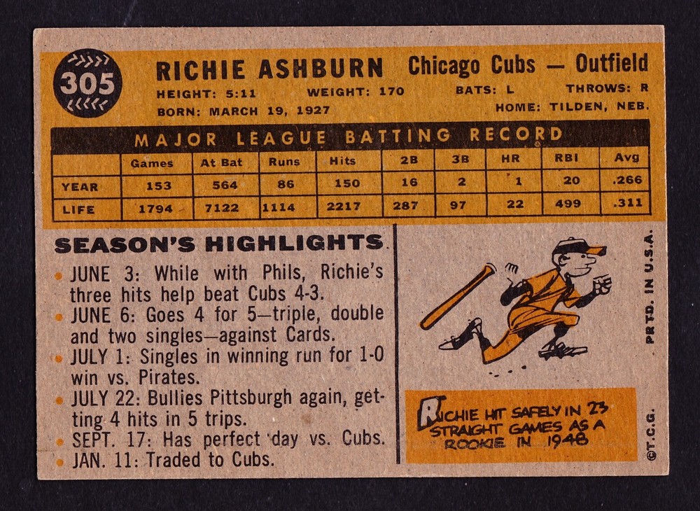 1960 TOPPS #305 RICHIE ASHBURN CUBS. CARD HAS NO CREASE. FREE SHIPPING. Inventory #221024