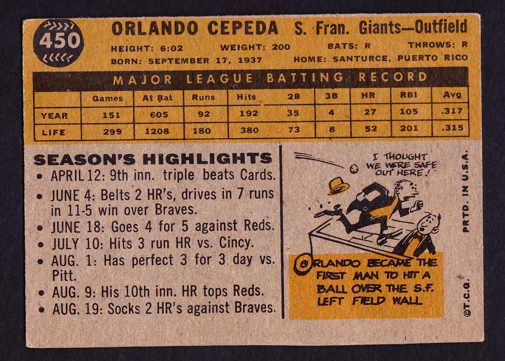 1960 TOPPS #450 ORLANDO CEPEDA GIANTS. CARD HAS NO CREASE . FREE SHIPPING. Inventory #240722-2