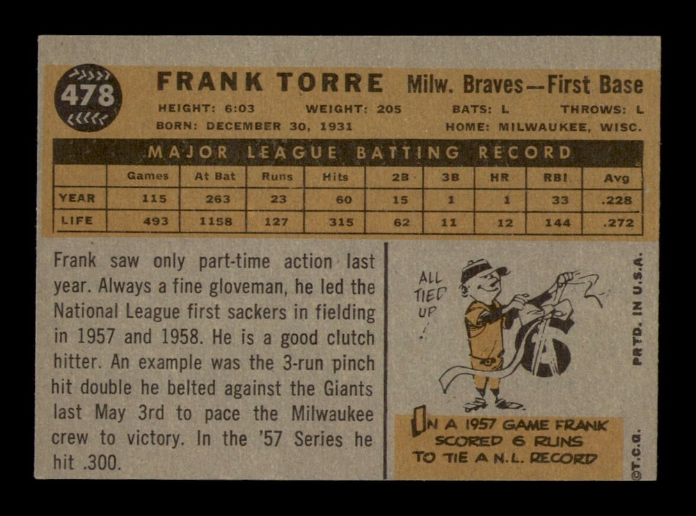 Original/Reprint: Original Series: Varies Season: 1960 Year: 1960 Player: Frank Torre Graded: No Card Manufacturer: Topps Sport: Baseball