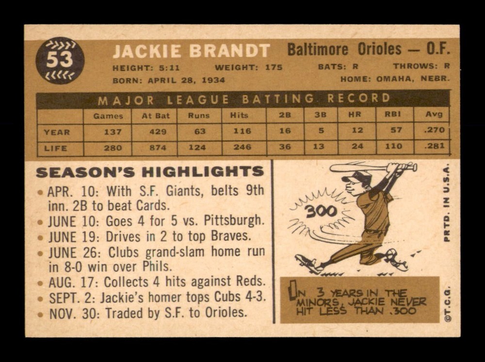 Sport: Baseball Original/Reprint: Original Player: Jackie Brandt Graded: No Card Manufacturer: Topps Year: 1960 Season: 1960