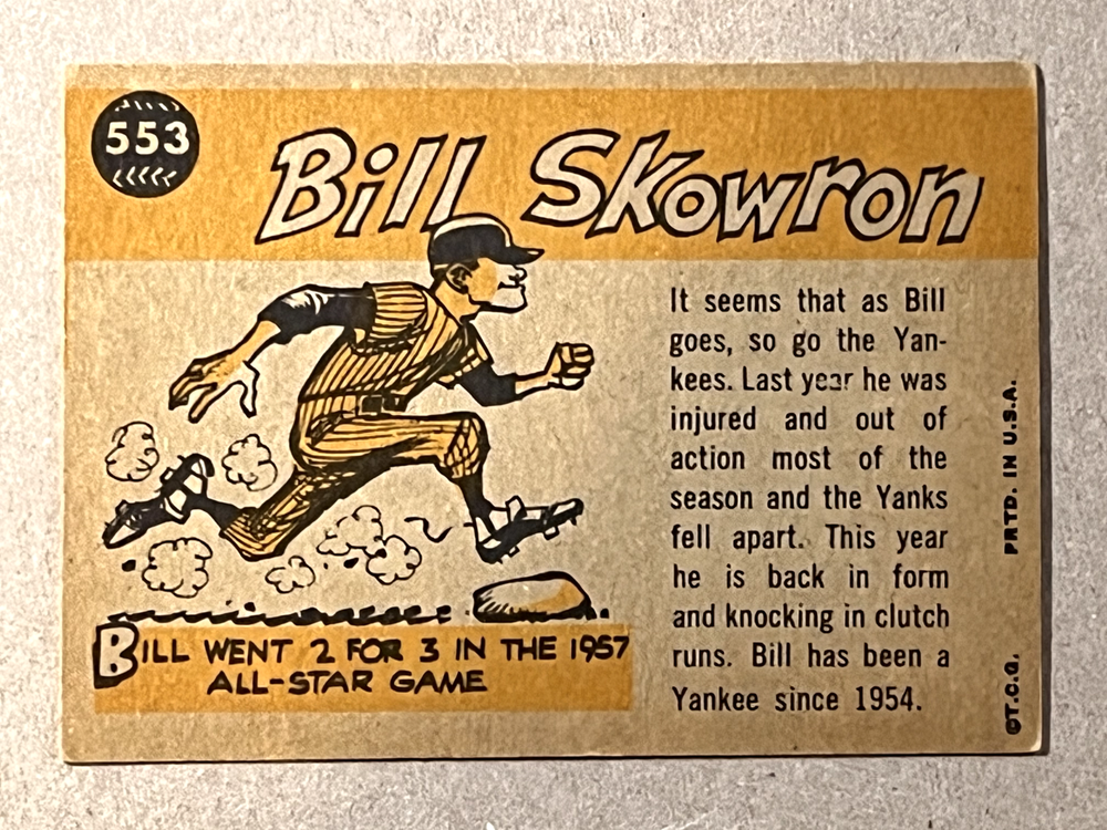 Capture a slice of baseball history with this vintage 1960 Topps sports trading card featuring Bill Skowron, the New York Yankees' notable infielder. Celebrated for his 1960 All-Star performance, this card is a must-have for collectors and fans alike, showcasing the iconic player in the prime of his career. Card number #553 from the renowned Topps set, this piece is an authentic representation of the era, steeped in the rich tradition of Major League Baseball. Whether you're adding to your personal collection or gifting a piece of the past, this card is an enduring symbol of the game's legacy.