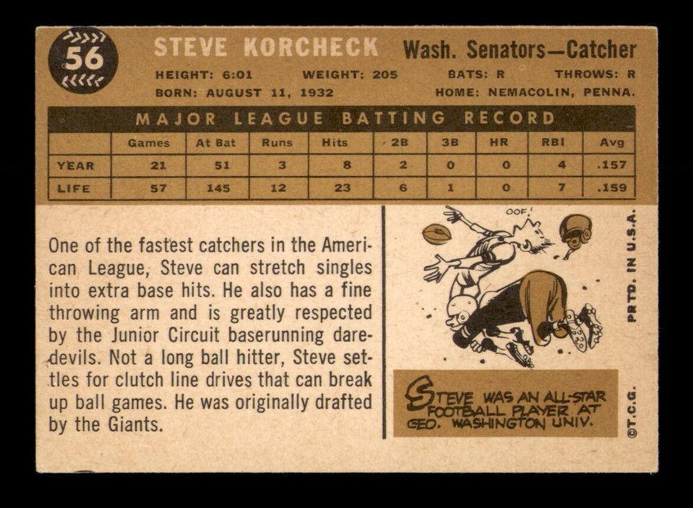 Graded: No Original/Reprint: Original Season: 1960 Card Manufacturer: Topps Year: 1960 Card Number: 56 Player: Steve Korcheck Sport: Baseball