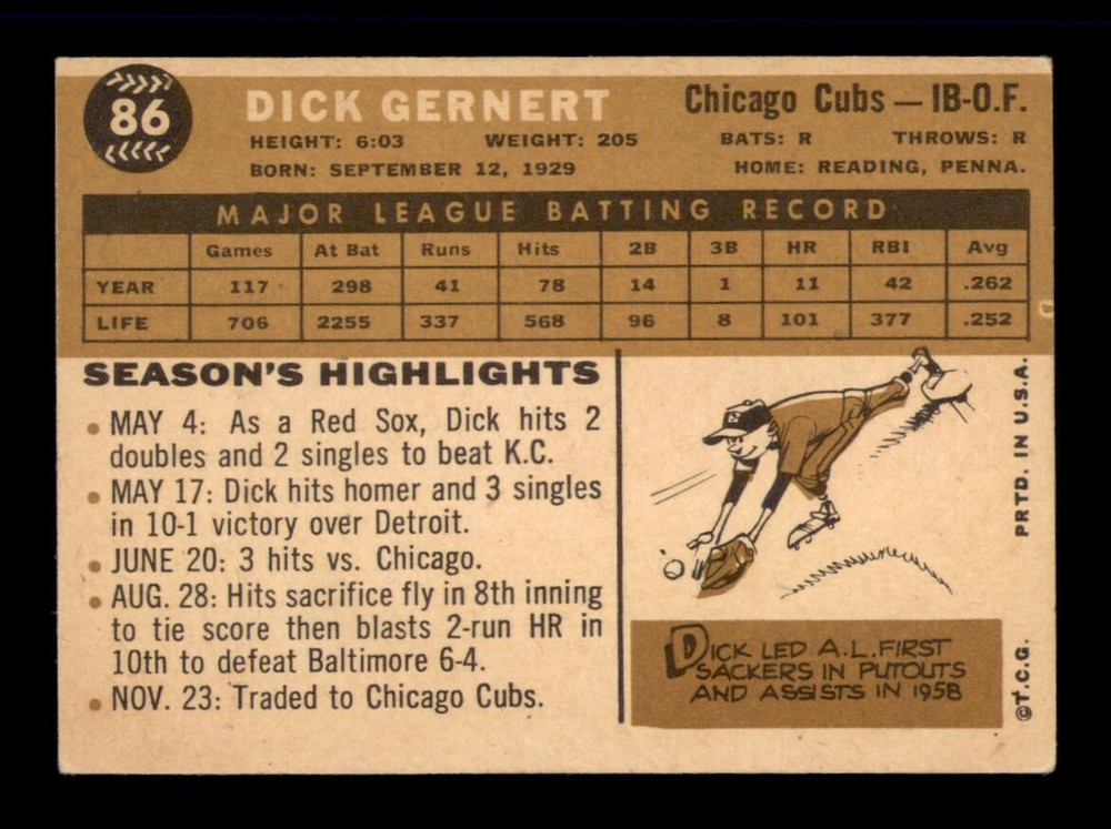 Graded: No Season: 1960 Player: Dick Gernert Sport: Baseball Series: Varies Card Condition: Excellent Card Manufacturer: Topps Team: Varies Card Number: 86 Original/Reprint: Original Year: 1960