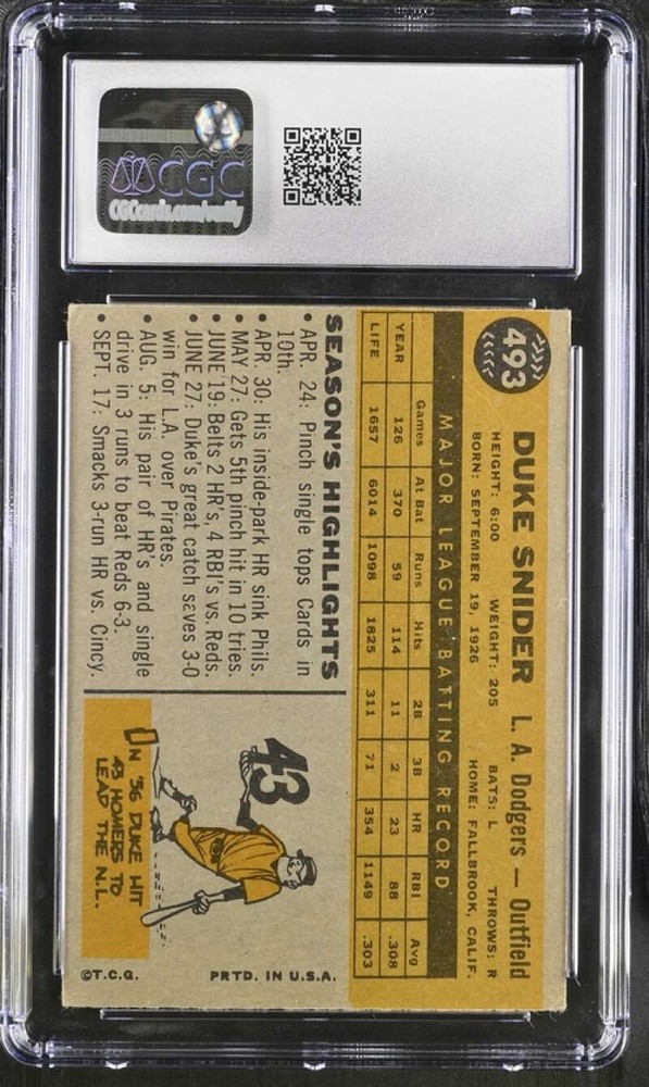 League:Major League Baseball (MLB)Sport:BaseballSet:1960 ToppsParallel/Variety:[Base]brand:ToppsFeatures:Base SetTeam:Los Angeles DodgersSeason:1960Series:ToppsManufacturer:ToppsPlayer/Athlete:Duke SniderCard Number:493