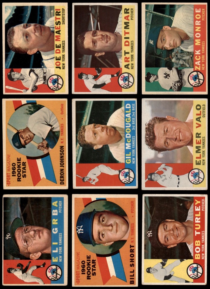 This set contains the following cards 1960 Topps #35 Whitey Ford 3.5 - VG+ Front Back 1960 Topps #51 Jim Coates 1.5 - FAIR Front Back 1960 Topps #65 Elston Howard 2 - GOOD Front Back 1960 Topps #83 Tony Kubek 3 - VG Front Back 1960 Topps #96 Ralph Terry 2 - GOOD Front Back 1960 Topps #102 Kent Hadley 3 - VG Front Back 1960 Topps #109 Clete Boyer 2 - GOOD Front Back 1960 Topps #134 - Deron Johnson Rookie Star 2 - GOOD Front Back 1960 Topps #142 - Bill Short Rookie Star 2 - GOOD Front Back 1960 Topps #160 - Mickey Mantle / Ken Boyer Rival All-Stars 2 - GOOD Front Back 1960 Topps #163 Hector Lopez 1.5 - FAIR Front Back 1960 Topps #183 Eli Grba 1.5 - FAIR Front Back 1960 Topps #196 Andy Carey 1.5 - FAIR Front Back 1960 Topps #204 Ryne Duren 2 - GOOD Front Back 1960 Topps #227 Casey Stengel 1.5 - FAIR Front Back 1960 Topps #237 Elmer Valo 2 - GOOD Front Back 1960 Topps #247 Gil McDougald 1.5 - FAIR Front Back 1960 Topps #270 Bob Turley 1.5 - FAIR Front Back 1960 Topps #283 John Blanchard 2 - GOOD Front Back 1960 Topps #315 Bobby Shantz 2 - GOOD Front Back 1960 Topps #329 Zack Monroe 2 - GOOD Front Back 1960 Topps #332 Yankees Team Checklist 2 - GOOD Front Back 1960 Topps #350 Mickey Mantle 2 - GOOD Front Back 1960 Topps #358 Joe DeMaestri 2 - GOOD Front Back 1960 Topps #370 Bill Skowron 2 - GOOD Front Back 1960 Topps #377 Roger Maris 2 - GOOD Front Back 1960 Topps #405 Bobby Richardson 2 - GOOD Front Back 1960 Topps #421 Duke Maas 1 - POOR Front Back 1960 Topps #430 Art Ditmar 1.5 - FAIR Front Back 1960 Topps #465 - Bill Dickey / Ralph Houk / Frank Crosetti / Ed Lopat Yankees Coaches 3 - VG Front Back 1960 Topps #480 Yogi Berra 2 - GOOD Front Back 1960 Topps #499 Johnny James 5 - EX Front Back 1960 Topps #522 Ken Hunt 3.5 - VG+ Front Back 1960 Topps #553 - Bill Skowron All-Star 3 - VG Front Back 1960 Topps #563 - Mickey Mantle All-Star 4 - VG/EX Front Back 1960 Topps #565 - Roger Maris All-Star 1.5 - FAIR Front Back This is a 1960 Topps New York Yankees Team Set. The Yankees returned to the World Series in 1960, but lost to the Pirates in 7 games. The #160 - Mickey Mantle / Ken Boyer Rival All-Stars, #350 Mickey Mantle, #563 - Mickey Mantle All-Star, and #565 - Roger Maris All-Star cards were removed in an effort to keep this team set affordable. ?They can all be purchased separately. Set breakdown by grade: Number of Cards in Set 36 Average Grade - Weighted by Value 2.74 - GD+ Average Grade - Unweighted 2.18 - GOOD Grade Breakdown 5 - EX 1 4 - VG/EX 1 3.5 - VG+ 2 3 - VG 4 2 - GOOD 18 1.5 - FAIR 9 1 - POOR 1 Dean's Cards offers a 100% Money Back Satisfaction Guarantee on all purchases. Just contact us within 10 days of the purchase date and we will refund your money or, when possible, replace the cards. 1960 Topps New York Yankees Team Set Won A.L. Pennant 2.5 - GD+ 6910078 If the scan in the listing says ACTUAL IMAGE, you will receive the card pictured. For cards issued after 1983, we will often use representative images and you will not receive the exact card pictured. Shipping Policy You only pay shipping on the first item. If you order multiple items on the same order, you will only be charged once for shipping. We do not combine shipping on multiple orders. To avoid multiple shipping charges we recommend using eBay's "Add to Cart" feature to check out multiple items in one transaction, or please request and allow for us to send an invoice to reflect the combined shipping charges. Canadian customers - We send all of our Canadian/International packages with tracking and cannot make any exceptions to this policy. Negotiating Prices All prices are final and we do not negotiate. This policy is to ensure that everyone knows that they are getting our best possible price. So please do not ask us to negotiate on price. Return Policy Dean's Cards has a 100% Money Back Satisfaction Guarantee on all purchases, as long as the product is returned within 30 days of receiving the product. Card Grading Each card is first reviewed by a member of our team, in order to detect any flaws that may not be visible on a scan, such as wrinkles, creases, print spots, or light stains. The vast majority of our vintage cards are professionally graded by the Dean's Cards Grading Software and include a 100% satisfaction guarantee. Our grading is on par with PSA standards when it comes to corners, centering and flaws - and tends to grade a bit tougher than PSA, on cards with a tilted image or rough edges. This grading software was developed to provide far better grading and consistency than can be achieved using the human eye. Determining the card's grade The sharpness of the corners and the degree to which a card was cut off-center determines the maximum possible grade that the card can receive. The card's grade is further reduced by any flaws or blemishes that it may have. Each card is evaluated on the following characteristics and assigned a score. Corners - Each corner of a card is individually analyzed, and then assigned a score on how square, sharp, and flawless it appears. Centering - The borders are measured, at multiple points along the edge, to determine the horizontal and vertical centering and tilt. Defects - The card is examined for imperfections, such as: size, print flaws, dings, stains, creases, or other wear which could lower its grade. Bonus for Perfect Centering - A vintage card, with near perfect centering, is given a one-half grade bonus. So when you buy one of our cards with a half-grade (e.g. 3.5 or 6.5) it will appear perfectly centered, both vertically and horizontally. Grading Criteria Worst Corner - A card can grade only as high as the worst corner will allow. Average Corner Tilt - The difference in width of a card border near the top, compared to the bottom. OCT - The sum of how far a card is Off-Center, plus its Tilt. Minimum Centering Requirements Eye Appeal - The combination of a card's centering, corners and tilt. Well-Centered - Cards that appear perfectly centered receive a bonus of one-