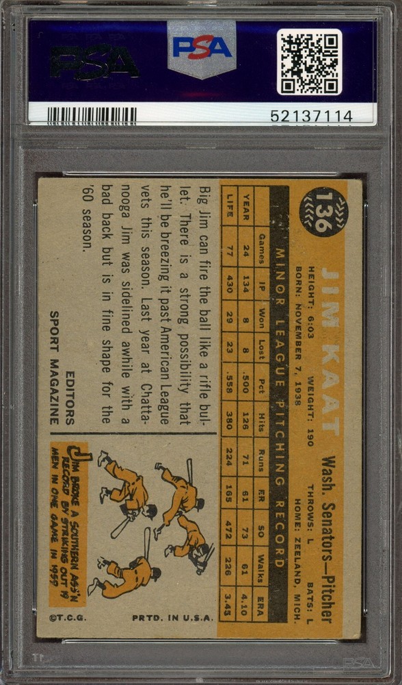 The Card pictured is the card you will receive unless there are multiple quantities then you will receive a card in the comparable grade. Cards in poor condition could have creasing, stains, rounded corners, pen marks or a combo of them. please see pics for a better understanding of cards condition. Very Good Washington Senators RC Jim Kaat #136 1960 Topps Topps 1960 Baseball .