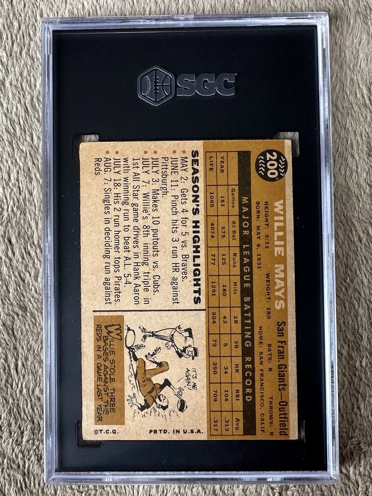 1960 Topps Willie Mays #200 card, graded SGC 4. Really awesome looking card of longtime San Francisco Giants Hall of Famer. Card is very nicely centered and a very nice graded vintage card of this Hall of Famer. An excellent addition to any baseball card collection. Please check out the photos and don’t hesitate to message with any questions. Will combine shipping whenever possible. Card shipped USPS ground advantage within 1-2 days of purchase.