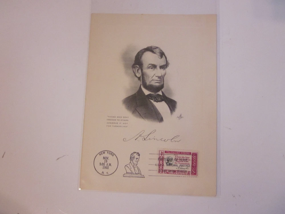 This rare and unique 1960 US FDC 1143 ABRAHAM LINCOLN Art Craft Engraved Card with FAUX Signature is a must-have for any serious stamp collector or political enthusiast. This beautiful piece of history features a 4 cent denomination and was issued between 1951-1960 in the United States. The card has been carefully crafted with high-quality art and engraving, making it a true work of art. It is ungraded and uncertified, but its authenticity can be verified by its cancellation type and place of origin. This item is perfect for adding to your collection or as a thoughtful gift for someone special.