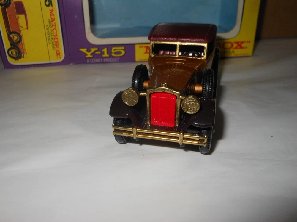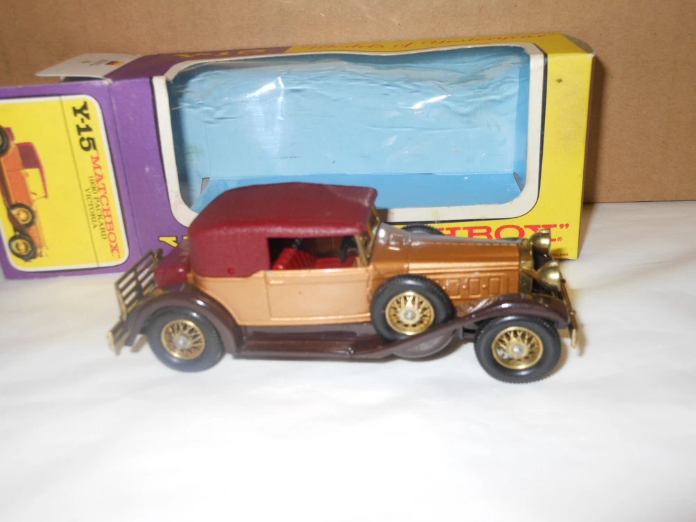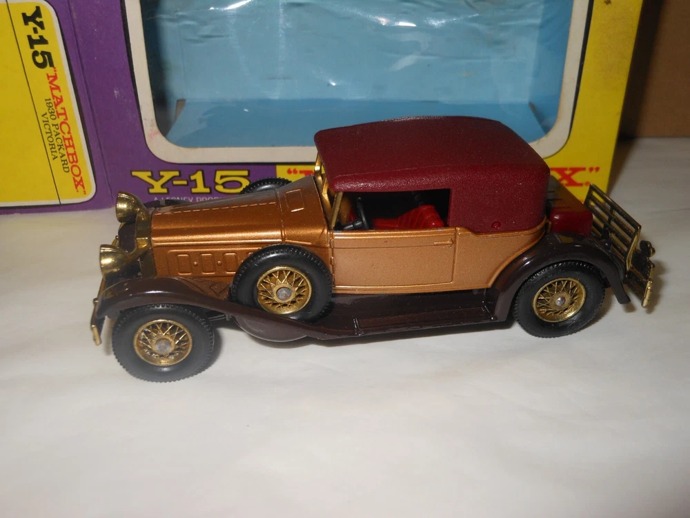 MATCHBOX MODELS OF YESTERYEAR 1930 Packard Victoria Y-15 (purple box) CIRA: 1969-1977 COLOUR: Gold Condition : Model Excellent. with minor wear as seen in photo With a good original box. With all end flaps attached. Knocks and wear to the corners of the box and fading as seen in photo. Please view the pictures for more details Combine postage welcome