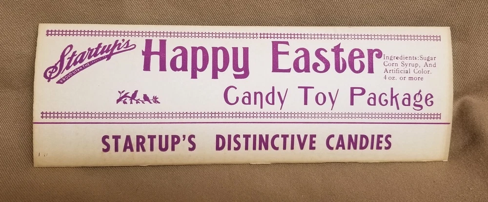 1960s Startups Candy Co Clear Toy Package Advert EASTER Provo UTAH VINTAGE 1960's Startup's Candy Co. Clear Candy Toy Package Advertisement EASTER Provo Utah VINTAGE This listing is for a piece of vintage Startup's Candy Company advertising for a clear candy toy package. Advertisement is Easter themed. Made in the 1960's. Advertisement is in excellent/used condition. It is new/old stock from the Startups Candy Factory in Provo, Utah. I could not find the exact date it was made, but I know it was sometime in the 1960's. It is a piece of cardboard with vintage purple lettering and graphics. Clear candy toys were placed with this packaging and displayed in stores. I do not know what the original candy toy looked like. The white front of the cardboard has some foxing to the edges. A retro and sweet piece of Easter decor perfect for anyone! Advertisement is 10" X 3 1/2". Please see my other 1900's-1970's antique Startup's and other candy advertising, boxes, and paper items listed for sale right now. Thanks! The pictures that are provided are for your convenience and are of the exact item being sold. Please examine all of the available pictures well before making any purchases. Please ask any questions before purchase. Thanks! Powered by SixBit's eCommerce Solution