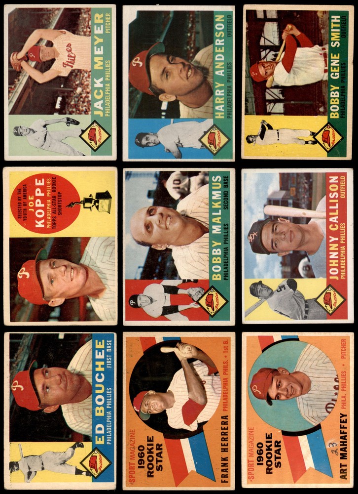 This set contains the following cards 1960 Topps #13 Wally Post 4.5 - VG/EX+ Front Back 1960 Topps #17 Johnny Callison 1.5 - FAIR Front Back 1960 Topps #52 Dave Philley 4 - VG/EX Front Back 1960 Topps #64 Jack Meyer 2 - GOOD Front Back 1960 Topps #130 - Frank Herrera Rookie Star 1.5 - FAIR Front Back 1960 Topps #138 - Art Mahaffey Rookie Star 1.5 - FAIR Front Back 1960 Topps #167 Valmy Thomas 2 - GOOD Front Back 1960 Topps #194 Bobby Gene Smith 1.5 - FAIR Front Back 1960 Topps #211 Taylor Phillips 2 - GOOD Front Back 1960 Topps #226 Eddie Sawyer 2 - GOOD Front Back 1960 Topps #251 Bobby Malkmus 2 - GOOD Front Back 1960 Topps #285 Harry Anderson 2 - GOOD Front Back 1960 Topps #319 Joe Koppe 1.5 - FAIR Front Back 1960 Topps #331 Henry Mason 3 - VG Front Back 1960 Topps #347 Ed Bouchee 1.5 - FAIR Front Back 1960 Topps #366 Dallas Green 4 - VG/EX Front Back 1960 Topps #384 Don Cardwell 4 - VG/EX Front Back 1960 Topps #438 Jim Coker 3 - VG Front Back 1960 Topps #486 Bobby Del Greco 4 - VG/EX Front Back This is a 1960 Topps Philadelphia Phillies Near Team Set. Dean's Cards has designed our Near Complete Team Sets using the majority of cards for that team - leaving out the expensive super-star rookie cards, high numbers, short-prints, and multi-player rookie cards, reducing the price. the other cards can then be added, from our inventory of over a million cards, as your budget allows. For the exact cards contained in this set, as well as their front and back scans, please see the description below. Set breakdown by grade: Number of Cards in Set 19 Average Grade - Weighted by Value 3.03 - VG Average Grade - Unweighted 2.50 - GD+ Grade Breakdown 4.5 - VG/EX+ 1 4 - VG/EX 4 3 - VG 2 2 - GOOD 6 1.5 - FAIR 6 This near team set contains 19 cards out of the possible 35 cards. This is not a complete set. The following cards have been omitted, in order to keep the cost of the set reasonable, and can be purchased separately.#302 Phillies Team Checklist This set does not include the following cards: #34 Sparky Anderson, #185 Jim Owens, #472 Al Dark, #97 Ted Lepcio, #451 Curt Simmons, #511 Ken Walters, #293 Gene Conley COR, #416 Humberto Robinson, #549 John Buzhardt, #466 Phillies Coaches - Ken Silvestri / Dick Carter / Andy Cohen, #82 Ruben Gomez, #523 Clay Dalrymple, #103 Turk Farrell, #264 Robin Roberts, #541 Tony Curry Dean's Cards offers a 100% Money Back Satisfaction Guarantee on all purchases. Just contact us within 10 days of the purchase date and we will refund your money or, when possible, replace the cards. 1960 Topps Philadelphia Phillies Near Team Set 3 - VG 6909733 (19 / 35 cards) If the scan in the listing says ACTUAL IMAGE, you will receive the card pictured. For cards issued after 1983, we will often use representative images and you will not receive the exact card pictured. Shipping Policy You only pay shipping on the first item. If you order multiple items on the same order, you will only be charged once for shipping. We do not combine shipping on multiple orders. To avoid multiple shipping charges we recommend using eBay's "Add to Cart" feature to check out multiple items in one transaction, or please request and allow for us to send an invoice to reflect the combined shipping charges. Canadian customers - We send all of our Canadian/International packages with tracking and cannot make any exceptions to this policy. Negotiating Prices All prices are final and we do not negotiate. This policy is to ensure that everyone knows that they are getting our best possible price. So please do not ask us to negotiate on price. Return Policy Dean's Cards has a 100% Money Back Satisfaction Guarantee on all purchases, as long as the product is returned within 30 days of receiving the product. Card Grading Each card is first reviewed by a member of our team, in order to detect any flaws that may not be visible on a scan, such as wrinkles, creases, print spots, or light stains. The vast majority of our vintage cards are professionally graded by the Dean's Cards Grading Software and include a 100% satisfaction guarantee. Our grading is on par with PSA standards when it comes to corners, centering and flaws - and tends to grade a bit tougher than PSA, on cards with a tilted image or rough edges. This grading software was developed to provide far better grading and consistency than can be achieved using the human eye. Determining the card's grade The sharpness of the corners and the degree to which a card was cut off-center determines the maximum possible grade that the card can receive. The card's grade is further reduced by any flaws or blemishes that it may have. Each card is evaluated on the following characteristics and assigned a score. Corners - Each corner of a card is individually analyzed, and then assigned a score on how square, sharp, and flawless it appears. Centering - The borders are measured, at multiple points along the edge, to determine the horizontal and vertical centering and tilt. Defects - The card is examined for imperfections, such as: size, print flaws, dings, stains, creases, or other wear which could lower its grade. Bonus for Perfect Centering - A vintage card, with near perfect centering, is given a one-half grade bonus. So when you buy one of our cards with a half-grade (e.g. 3.5 or 6.5) it will appear perfectly centered, both vertically and horizontally. Grading Criteria Worst Corner - A card can grade only as high as the worst corner will allow. Average Corner Tilt - The difference in width of a card border near the top, compared to the bottom. OCT - The sum of how far a card is Off-Center, plus its Tilt. Minimum Centering Requirements Eye Appeal - The combination of a card's centering, corners and tilt. Well-Centered - Cards that appear perfectly centered receive a bonus of one-half grade. Flaws, defects and other imperfections - can lower a card's grade. Card Backs - the above criteria is also considered, for the back of the cards, but does not inflict as severe of a pena
