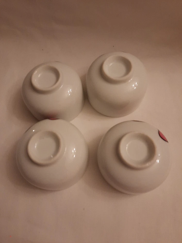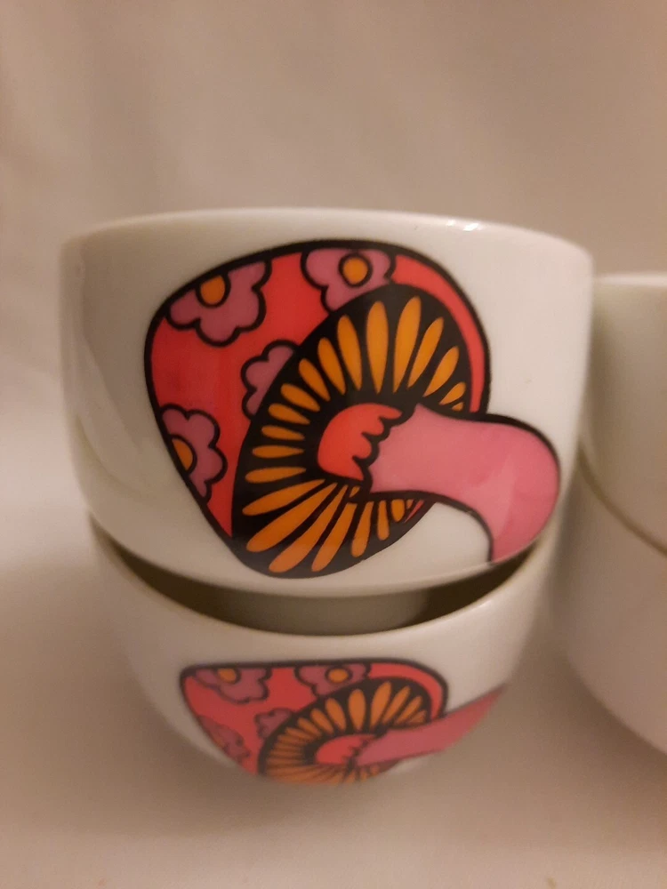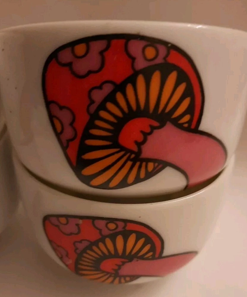 Add some retro charm to your dining table with this set of four vintage serving bowls. The porcelain bowls feature a colorful orange and white mushroom design, perfect for a mid-century modern themed dinner party. Each bowl is round in shape and 2.25 in height making them ideal for serving. The set includes four bowls and is manufactured in 1960 using the pottery production technique. The brand is Serving Bowls Mushroom and the style is art pottery. Perfect for collectors or those who appreciate unique and vintage pieces.