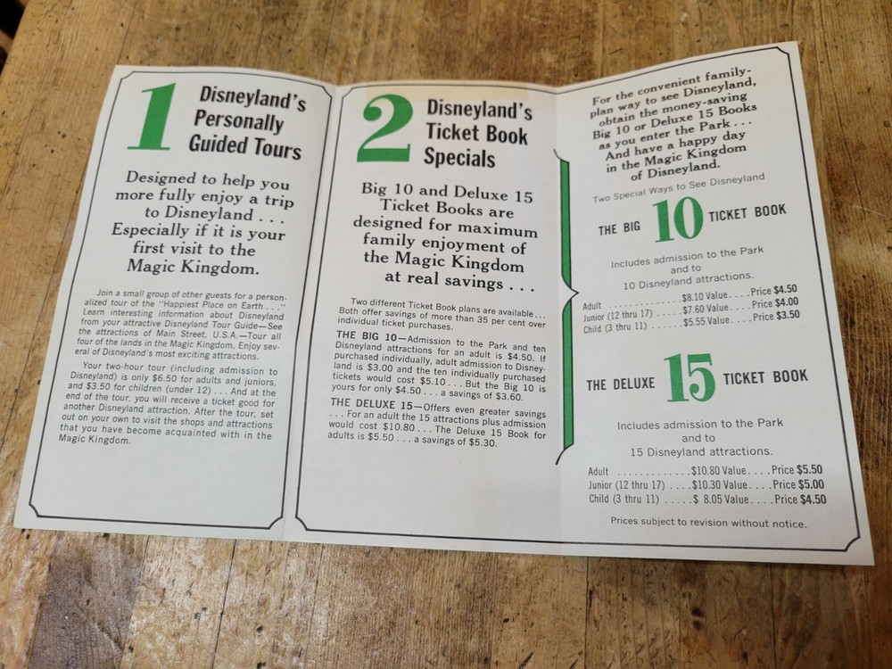 Here is a 1960's Disneyland ticket price folder for your very early Disney collection! It is in good condition with creases, folds, edgewear, stains, marks and surface wear. It still has bright colors. Item is sold “as is”. I try to describe my items as accurately as possible. Please email me with any questions before bidding. NO INTERNATIONAL BIDDERS PLEASE Shipment will take place after receipt of cleared payment. I will package your item carefully for shipment. THANK YOU FOR LOOKING! PLEASE LOOK FOR MY OTHER DISNEYLAND ITEMS! I AM ALWAYS HAPPY TO COMBINE ITEMS FOR SHIPMENT TO SAVE YOU MONEY!