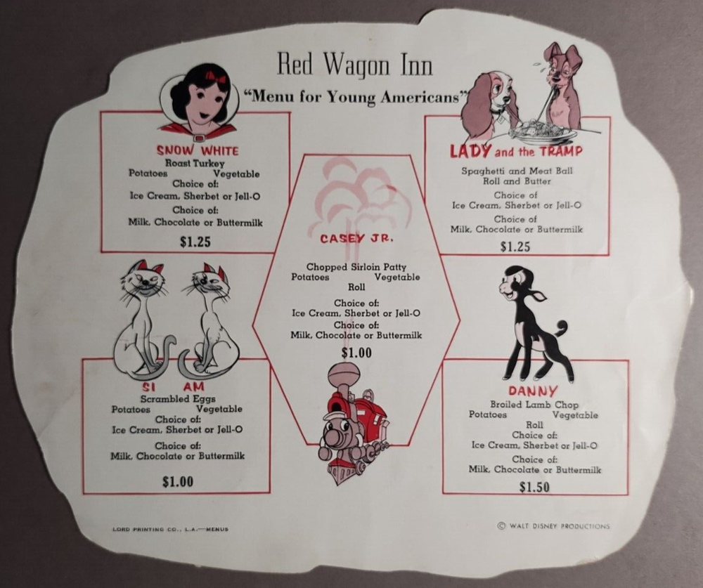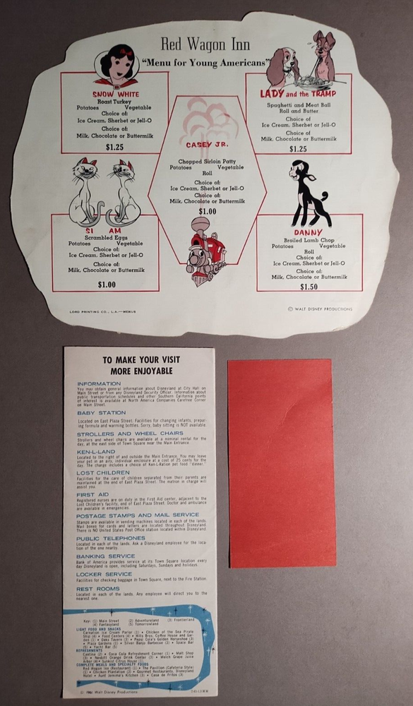 1961 Disneyland Red Wagon Inn Child's Menu, Brochure & Parking Pass . Menu(1960s) is approx 9-1/4" x 7-7/8. Brochure(1961) is 3-3/4" x 8-3/8". Ticket(1960s) is 5" x 2-5/8". See Images. Menu has tape on front from scrapbook & some minor wrinkling/creases from removal. Brochure has some light soiling. No folds, etc. Parking pass has two bends/creases & very small stain at bottom. B5-65 I started selling on here in 1998. I actively listed till around 2013. Then allowed the listings to die a slow death. Last sale was in 2021. After a 10+ year absence from listing on here due to burnout, I have decided to return. My accumulations of items have grown since I stopped listing. I have in excess of 50000 items to list. 90+ percent of it is ephemera and paper items. I do NOT sell reprints or reproductions. I always combine shipping either by refunding excess shipping or sending invoice with adjust shipping if you choose not to pay first.