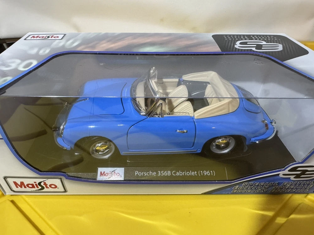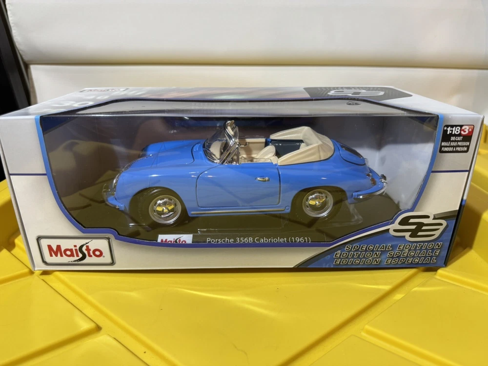Experience the beauty and craftsmanship of this stunning 1961 Porsche 356B Cabriolet Speciale Special Edition diecast model by Maisto. This collectible piece from the Maisto Supercar Collection is a true representation of the iconic vehicle, with intricate details that will impress any car enthusiast. The sleek blue exterior and classic design make it a perfect addition to any collection. Crafted from high-quality diecast material, this model is built to last and is suitable for ages 4 and up. The 1:18 scale provides a realistic feel, and the model's features, including the convertible top and special edition label, add to its charm. Display it in your home or office, or gift it to a fellow car lover. This Porsche 356B Cabriolet model is sure to be a conversation starter. BRAND NEW