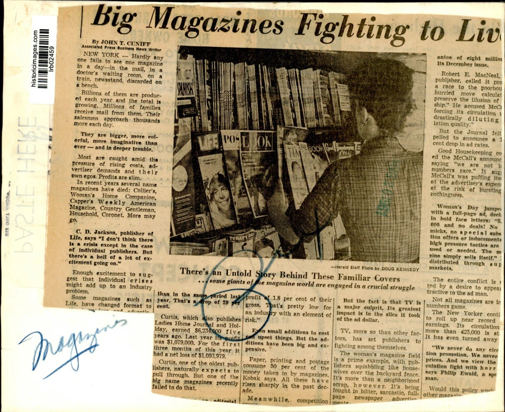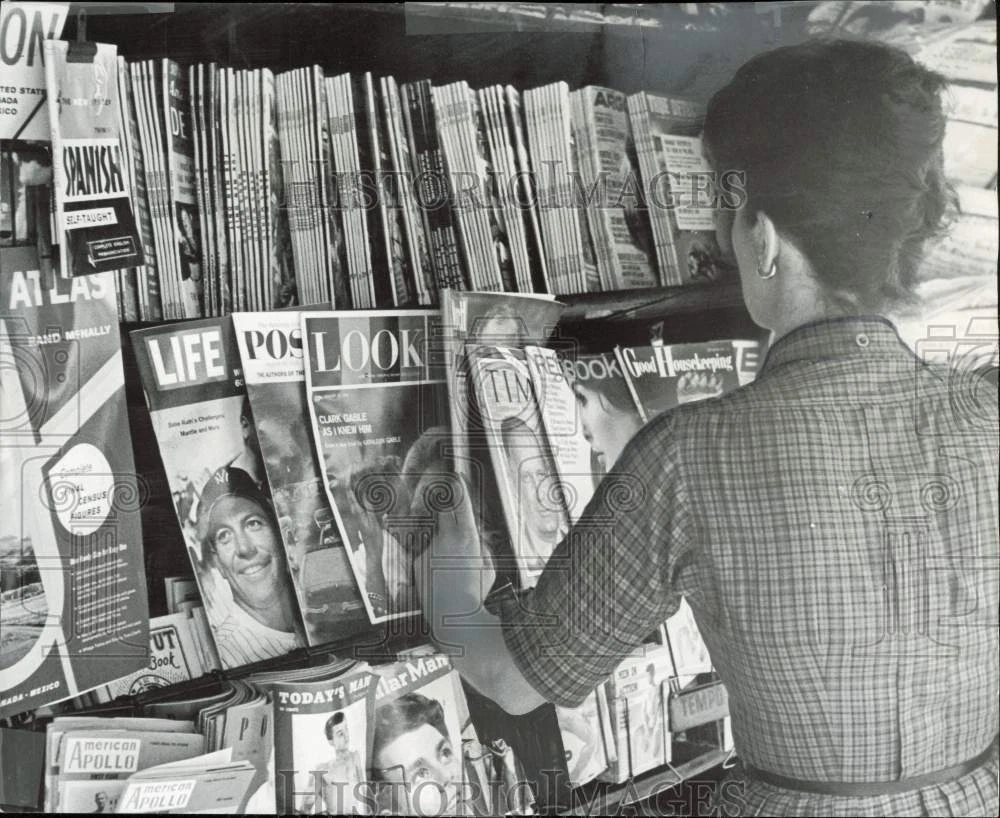 ebay template Note: Please study the images carefully to determine the condition of this vintage photograph, as it may not be in perfect condition. It may contain wrinkles, cracks, and possibly even tears due to its age and how it was handled before it got to us. A scanner may interpret colors and contrast differently than human eyes will, so it is possible that the actual photograph may be slightly darker or lighter in person. This vintage photograph is offered for sale as a collectible item and conveys no transfer of copyright. 1961 Press Photo Woman checks magazine on a rack at a New York magazine stand New York - Hardly any one fails to see one magazine in a day, in the mail, in a doctor's waiting room, on a train, newsstand, discarded on a bench. Billions of them are produced each year and the total is growing. Millions of families receive mail from them. Their salesmen approach thousands more each day. There's an untold story behind these familiar covers...some giants of the magazine world are engaged in a crucial struggle. Photo measures 10 x 8.25 inches. Photo Is dated 1961. PHOTO FRONT PHOTO BACK Historic Images Part Number: lrb02459 Sell Smarter with Kyozou. Inventory and Ecommerce Management