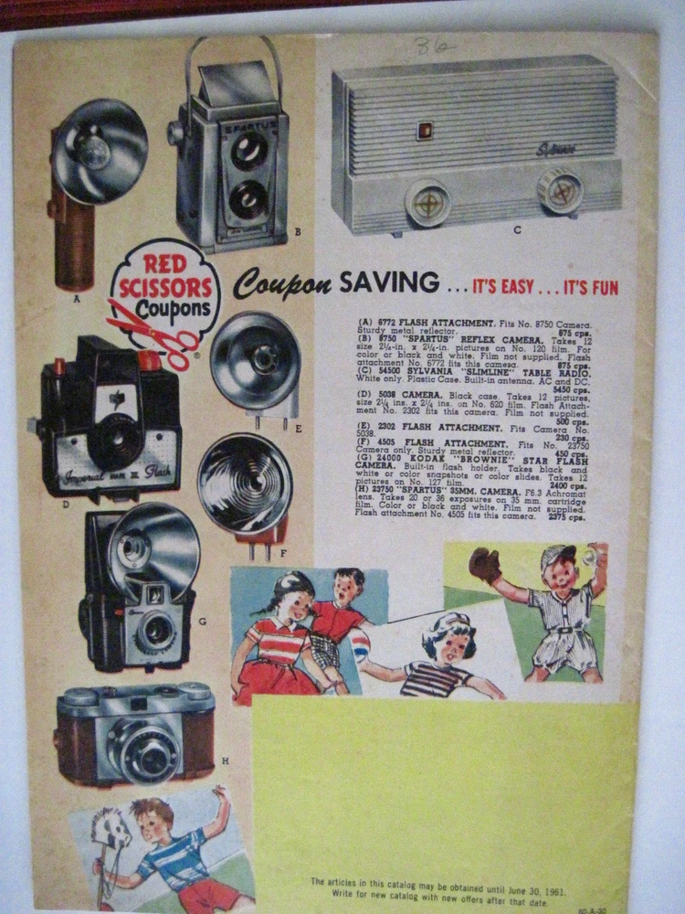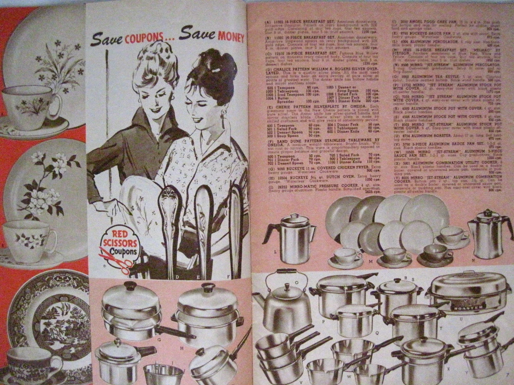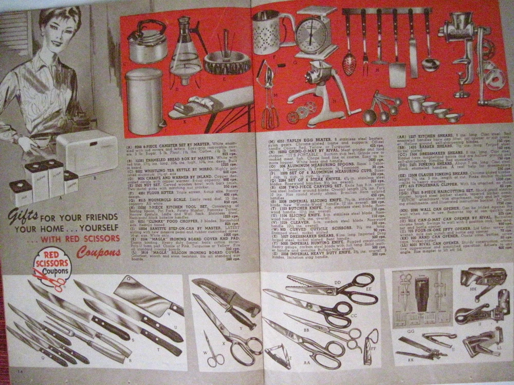 Description: This 1961 "Red Scissors Coupon Book" has Great Colored Period Pictures. History - " Trading stamps are small paper coupons given to customers by merchants in loyalty marketing programs that predate the modern loyalty card . Like the similarly-issued retailer coupons, these stamps only had a minimal cash value of a few mils (hundredths of a cent) individually, but when a customer accumulated a number of them, they could be exchanged with the trading stamp company (usually a third-party issuer of the stamps) for premiums , such as toys, personal items, house wares, furniture and appliances. The practice started in the 1890s, at first given only to customers who paid for purchases in cash , to reward those who did not purchase on credit . The bottom fell out of the trading stamp business in 1965, when many supermarkets stopped issuing stamps altogether and started spending more money to advertise lower prices. [5] Their role has been subsumed by rewards programs offered by credit card companies and other loyalty programs , such as grocery "Preferred Customer" cards." Measures - 7" W x 10" H. Condition: Corners and edges are slightly worn. In good condition. Free shipping in the U.S. Items are shipped out every Monday morning. Like what you see? Check out my other items ! 02/2015 Nancy
