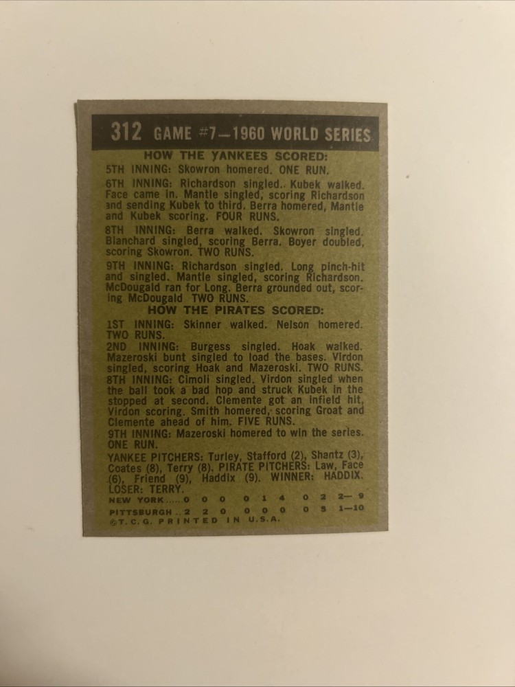 The product is a 1961 Topps baseball trading card featuring Bill Mazeroski from the Pittsburgh Pirates. This particular card commemorates Mazeroski's iconic game-winning home run in Game 7 of the World Series. It is autographed by Mazeroski, adding to its value and collectibility. The card is an original from the 1961 Topps set, with the card number being 312. This highly sought-after piece of baseball memorabilia is a must-have for fans and collectors looking to own a piece of baseball history.