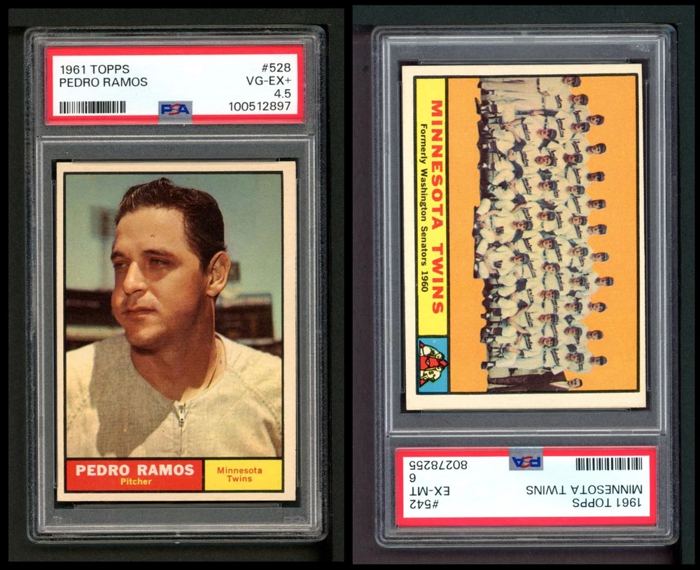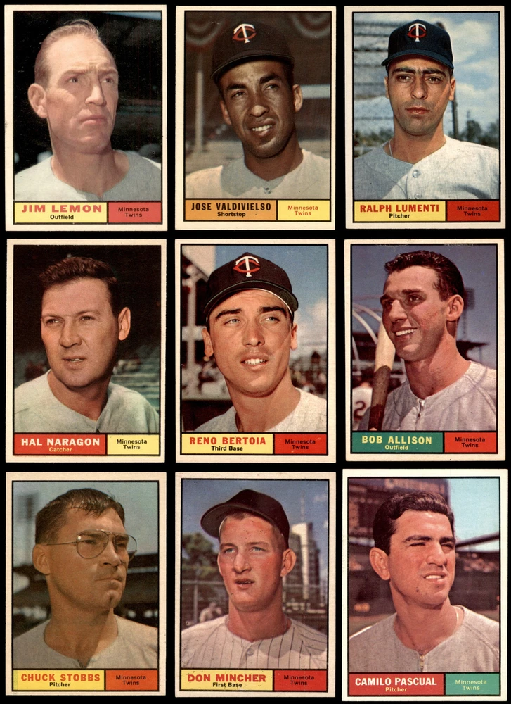This set contains the following cards 1961 Topps #4 Lenny Green 5 - EX Front Back 1961 Topps #21 Zoilo Versalles 6 - EX/MT Front Back 1961 Topps #36 Jack Kralick 5 - EX Front Back 1961 Topps #63 Jim Kaat 6 - EX/MT Front Back 1961 Topps #80 Harmon Killebrew 6 - EX/MT Front Back 1961 Topps #92 Hal Naragon 6 - EX/MT Front Back 1961 Topps #108 Dan Dobbek 6 - EX/MT Front Back 1961 Topps #123 Billy Gardner 6 - EX/MT Front Back 1961 Topps #153 Don Lee 6 - EX/MT Front Back 1961 Topps #186 May Have Border Break Elmer Valo 6 - EX/MT Front Back 1961 Topps #201 Pete Whisenant 6 - EX/MT Front Back 1961 Topps #226 Harry Lavagetto 6 - EX/MT Front Back 1961 Topps #235 Camilo Pascual 6 - EX/MT Front Back 1961 Topps #254 Ted Sadowski 6 - EX/MT Front Back 1961 Topps #289 Ray Moore 5 - EX Front Back 1961 Topps #315 Earl Battey 6 - EX/MT Front Back 1961 Topps #336 Don Mincher 6 - EX/MT Front Back 1961 Topps #355 Bob Allison 6 - EX/MT Front Back 1961 Topps #374 Paul Giel 6 - EX/MT Front Back 1961 Topps #392 Reno Bertoia 6 - EX/MT Front Back 1961 Topps #431 Chuck Stobbs 6 - EX/MT Front Back 1961 Topps #450 Jim Lemon 6 - EX/MT Front Back 1961 Topps #469 Ralph Lumenti 6 - EX/MT Front Back 1961 Topps #504 Billy Consolo 6 - EX/MT Front Back 1961 Topps #528 Pedro Ramos PSA 4.5 - VG/EX+ Front Back 1961 Topps #542 Twins Team PSA 6 - EX/MT Front Back 1961 Topps #557 Jose Valdivielso 5 - EX Front Back This 1961 Topps Minnesota Twins Team Set contains the 1961 Topps Twins baseball cards and makes a great gift for any Twins fan. ?With an inventory of over 15,000 team sets, Dean's Cards has Team Sets & Near Team Sets for just about every team, in multiple conditions, for all sports, for most major sets issued between 1909 and 1979. First year of the Minnesota Twins after they moved from Washington. The team eventually became a mid-1960s power house led by stars Such as Harmon Killebrew.