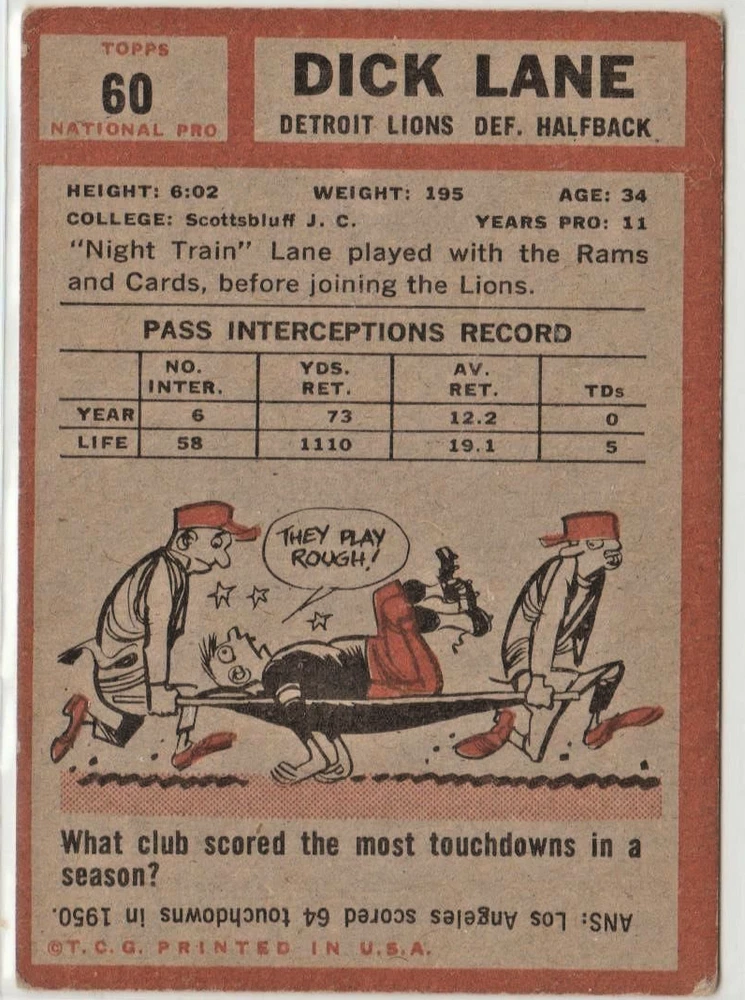 League:National Football League (NFL)Manufacturer:ToppsSet:1962 ToppsSport:FootballPlayer/Athlete:Dick LaneSeason:1962Type:Sports Trading CardTeam:Detroit LionsCard Number:60