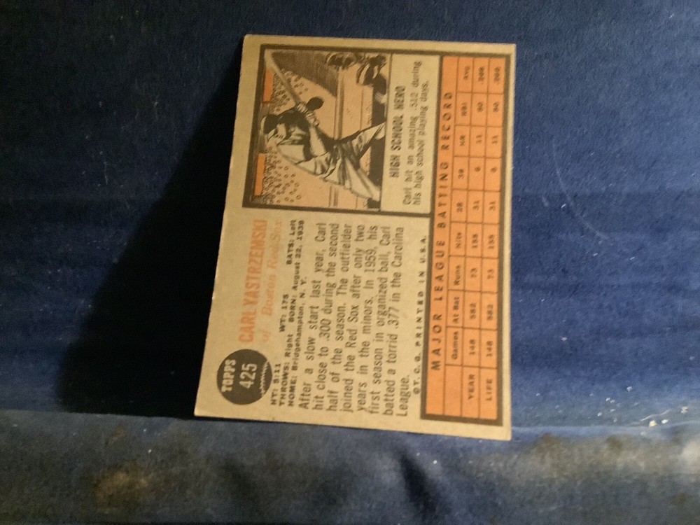 The product is a 1962 Topps trading card featuring Carl Yastrzemski of the Boston Red Sox from Major League Baseball. The card is part of the base set, has a standard size, and is numbered #425. It is not autographed and was manufactured by Topps in 1962. The card is off center right to left. All four corners have dings.