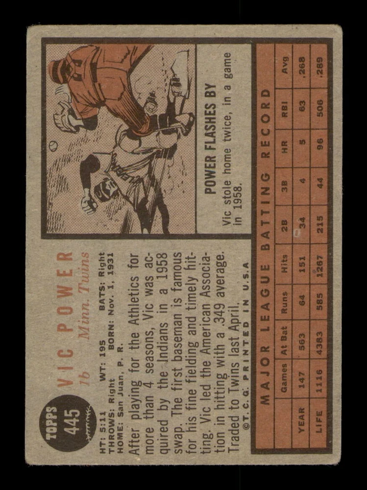 Player: Vic Power Original/Reprint: Original Year: 1962 Sport: Baseball Card Number: 445 Graded: No Card Manufacturer: Topps Season: Varies