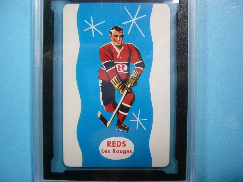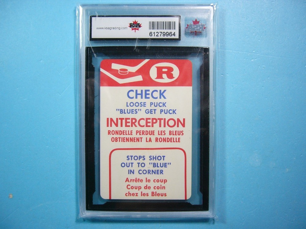 YOU ARE BIDDING ON A VERY RARE 1962/63 KELLOGG'S HOCKEY GAME CARD. TEAM REDS CHECK / LOOSE PUCK CARD IS GRADED 10 BY KSA IN GEM MINT CONDITION. SEE SCANS FOR FURTHER CONDITION. GREAT COLOUR & GLOSS--A SUPER SHARP, CLEAN & ATTRACTIVE CARD FROM THIS UNIQUE HOCKEY SET!!! THANKS FOR LOOKING AND GOOD LUCK!!! ------------------------------------------------------------------------------------------------------------------------------------------------------- SHIPPING WITHIN CANADA WITH TRACKING & INSURANCE IS $12.50, TO THE UNITED STATES $15.00, AND INTERNATIONALLY $90.00 (EVERYWHERE ELSE). ITEM WILL BE CAREFULLY PACKAGED SO AS NOT TO GET DAMAGED DURING SHIPPING. I DO COMBINE SHIPPING ON MULTIPLE PURCHASES--ONLY 50 CENTS MORE PER ADDITIONAL SINGLE GRADED CARD, OR 20 CENTS MORE PER ADDITIONAL SINGLE UNGRADED PHOTO OR CARD. TAKE A LOOK AT MY OTHER AUCTIONS AND SAVE ON SHIPPING!!!