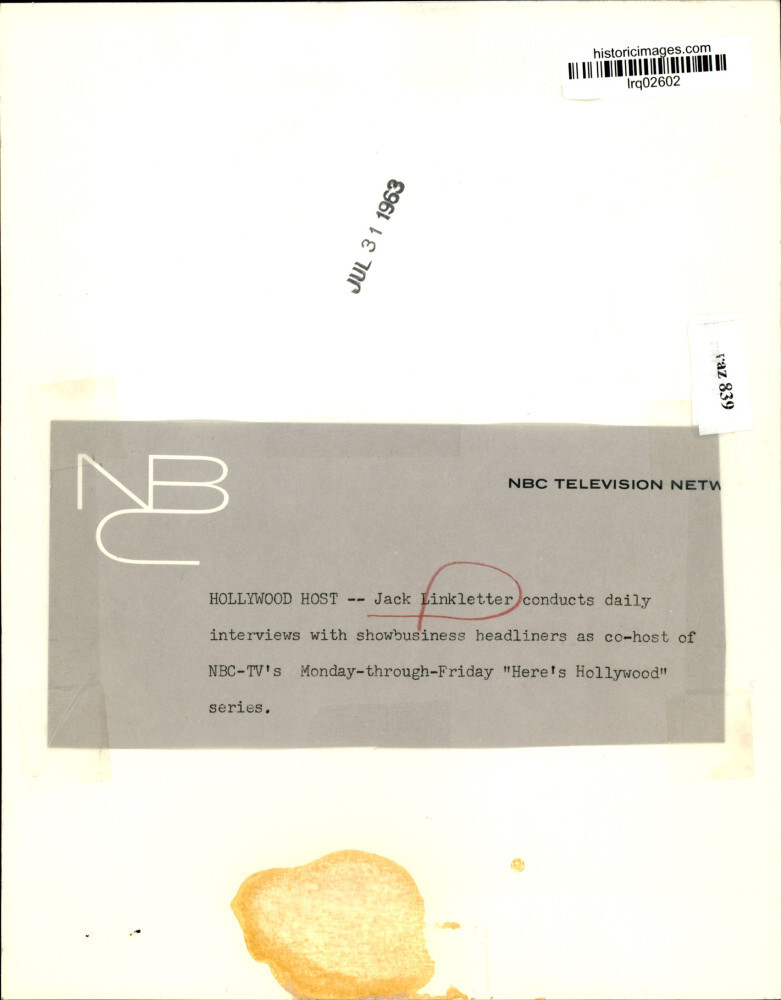 ebay template Note: Please study the images carefully to determine the condition of this vintage photograph, as it may not be in perfect condition. It may contain wrinkles, cracks, and possibly even tears due to its age and how it was handled before it got to us. A scanner may interpret colors and contrast differently than human eyes will, so it is possible that the actual photograph may be slightly darker or lighter in person. This vintage photograph is offered for sale as a collectible item and conveys no transfer of copyright. 1963 Press Photo Jack Linkletter, TV Host - lrq02602 Jack Linkletter conducts daily interviews with showbusiness headliners as co-host of NBC-TV's Monday-through-Friday "Here's Hollywood" series. Photo measures 7 x 9 inches. Photo Is dated 1963. PHOTO FRONT PHOTO BACK Historic Images Part Number: lrq02602 Sell Smarter with Kyozou. Inventory and Ecommerce Management