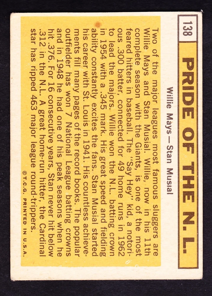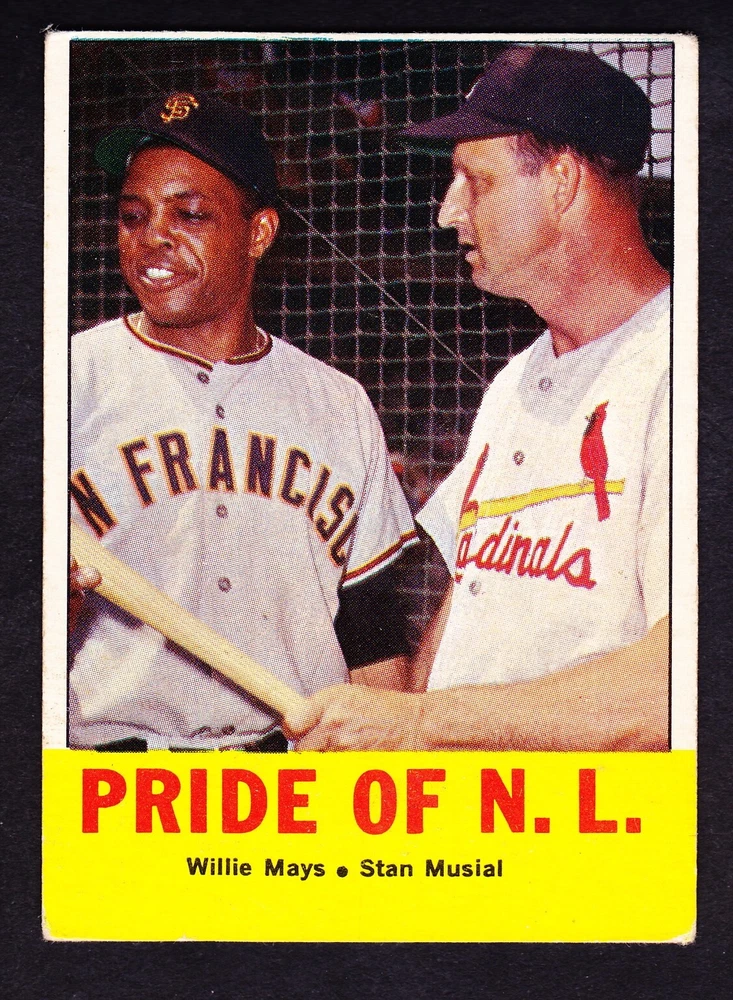 Sport:BaseballLeague:Major League (MLB)Year Manufactured:1963Team:San Francisco Giants, St. Louis CardinalsSet:1963 ToppsType:Sports Trading CardManufacturer:ToppsCard Number:#138Season:1963Player/Athlete:Stan Musial, Willie MaysFeatures:Pride Of N.L.