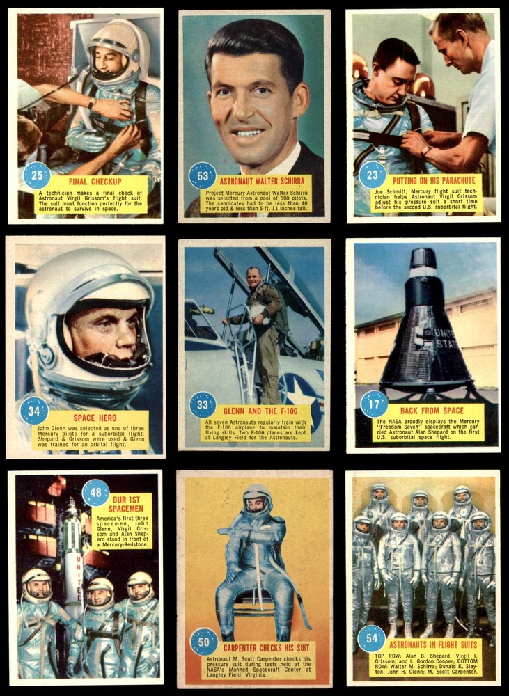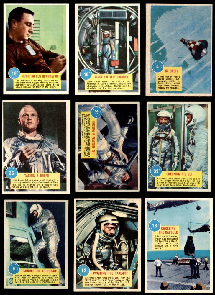 This set contains the following cards 1963 Topps Astronauts 3-D Viewer 4 - VG/EX Front Back 1963 Topps Astronauts #1 Picking the Astronaut Team 5 - EX Front Back 1963 Topps Astronauts #2 Floating Astronauts 5 - EX Front Back 1963 Topps Astronauts #3 Testing the Chimps 4 - VG/EX Front Back 1963 Topps Astronauts #4 In Orbit 4 - VG/EX Front Back 1963 Topps Astronauts #7 The Seven Astronauts 4 - VG/EX Front Back 1963 Topps Astronauts #8 Takeoff Inspection 3 - VG Front Back 1963 Topps Astronauts #9 - Wally Schirra Training the Astronaut 5 - EX Front Back 1963 Topps Astronauts #12 Awaiting the Take-off 5 - EX Front Back 1963 Topps Astronauts #13 - Alan Shepard Shepard in Space 5 - EX Front Back 1963 Topps Astronauts #16 Carrying the Capsule 5 - EX Front Back 1963 Topps Astronauts #17 - Alan Shepard Back from Space 5 - EX Front Back 1963 Topps Astronauts #19 - Gus Grissom Reporting New Information 5 - EX Front Back 1963 Topps Astronauts #20 - Gus Grissom Spacesuit Checkup 4 - VG/EX Front Back 1963 Topps Astronauts #22 - Gus Grissom Putting on Space Helmet 5 - EX Front Back 1963 Topps Astronauts #23 - Gus Grissom Putting on his parachute 5 - EX Front Back 1963 Topps Astronauts #24 - Gus Grissom Grissom in pressure suit 5 - EX Front Back 1963 Topps Astronauts #25 - Gus Grissom Final checkup 5 - EX Front Back 1963 Topps Astronauts #26 - Gus Grissom Grissom awaits countdown 3 - VG Front Back 1963 Topps Astronauts #27 - Gus Grissom Grissom Gets Ready 4 - VG/EX Front Back 1963 Topps Astronauts #29 Grissom Blasts Off 4 - VG/EX Front Back 1963 Topps Astronauts #30 - Gus Grissom Grissom in Space 5 - EX Front Back 1963 Topps Astronauts #31 Mercury Atlas 4 4 - VG/EX Front Back 1963 Topps Astronauts #33 - John Glenn Glenn and the F-106 5 - EX Front Back 1963 Topps Astronauts #34 - John Glenn Space Hero 4 - VG/EX Front Back 1963 Topps Astronauts #36 - John Glenn Taking Break 4 - VG/EX Front Back 1963 Topps Astronauts #37 - John Glenn Rest day for Glenn 5 - EX Front Back 1963 Topps Astronauts #39 - John Glenn Checking his suit 5 - EX Front Back 1963 Topps Astronauts #40 - John Glenn Inside the test chamber 5 - EX Front Back 1963 Topps Astronauts #41 - John Glenn Glenn in training 4 - VG/EX Front Back 1963 Topps Astronauts #44 - John Glenn Before Glenn's take off 5 - EX Front Back 1963 Topps Astronauts #46 - John Glenn 1st man in Orbit 2 - GOOD Front Back 1963 Topps Astronauts #48 - John Glenn / Gus Grissom / Alan Shepard Our 1st Spacemen 5 - EX Front Back 1963 Topps Astronauts #50 - Scott Carpenter Carpenter Checks His Suit 4 - VG/EX Front Back 1963 Topps Astronauts #52 - Gordon Cooper Astronaut Gordon Cooper 3 - VG Front Back 1963 Topps Astronauts #53 - Wally Schirra Astronaut Walter Schirra 5 - EX Front Back 1963 Topps Astronauts #54 Astronaut in Flight Suits 5 - EX Front Back This 1963 Topps Astronaut 3-D Almost Complete Set consists of the majority of the 55 standard sized cards, each measuring 2 by 3 inches. The 1963 Topps Astronaut 3-D cards feature NASA's Mercury 7 astronauts, their training, equipment, capsules, and flights in space that were made famous in the movie, The Right Stuff.?? The cards are easily identified by green and orange pictures of men in space.? The 1963 Topps Astronaut 3-D cards were not issued in large numbers and complete sets are getting very difficult to locate. Set breakdown by grade: Number of Cards in Set 37 Average Grade - Weighted by Value 4.55 - VG/EX+ Average Grade - Unweighted 4.43 - VG/EX+ Grade Breakdown 5 - EX 21 4 - VG/EX 12 3 - VG 3 2 - GOOD 1 . This almost complete set contains 37 cards out of the possible 56 cards. This is not a complete set. This set does not include the following cards: #5 Recovery Training, #6 Space Explorers, #10 Astronaut Alan Shepard, #11 The First US Astronaut - Alan Shepard, #14 Picking up Shepard - Alan Shepard, #15 Successful Recovery, #18 Astronaut Virgil Grissom - Gus Grissom, #21 Grissom in Spacesuit - Gus Grissom, #28 2nd US Spaceman - Gus Grissom, #32 Astronaut John Glenn - John Glenn, #35 Glenn and Grissom - John Glenn, #38 Getting into the suit - John Glenn, #42 Posing for photographers - John Glenn, #43 Studying his maps - John Glenn, #45 Glenn in Space - John Glenn, #47 Glenn Meets the President - John Glenn, #49 Astronaut Carpenter - Scott Carpenter, #51 Astronaut Donald Slayton - Deke Slayton, #55 Astronaut Checklist Dean's Cards offers a 100% Money Back Satisfaction Guarantee on all purchases. Just contact us within 10 days of the purchase date and we will refund your money or, when possible, replace the cards. 1963 Topps Astronauts 3D Almost Complete Set 4.5 - VG/EX+ 6908799 (37 / 56 cards) If the scan in the listing says ACTUAL IMAGE, you will receive the card pictured. For cards issued after 1983, we will often use representative images and you will not receive the exact card pictured. Shipping Policy You only pay shipping on the first item. If you order multiple items on the same order, you will only be charged once for shipping. We do not combine shipping on multiple orders. To avoid multiple shipping charges we recommend using eBay's "Add to Cart" feature to check out multiple items in one transaction, or please request and allow for us to send an invoice to reflect the combined shipping charges. Canadian customers - We send all of our Canadian/International packages with tracking and cannot make any exceptions to this policy. Negotiating Prices All prices are final and we do not negotiate. This policy is to ensure that everyone knows that they are getting our best possible price. So please do not ask us to negotiate on price. Return Policy Dean's Cards has a 100% Money Back Satisfaction Guarantee on all purchases, as long as the product is returned within 30 days of receiving the product. Card Grading Each card is first reviewed by a member of our team, in order to detect any flaws that may not be visible on a scan, such as wrinkles, creases, print spots, or light stains. The vast majority of our vintage cards are pr