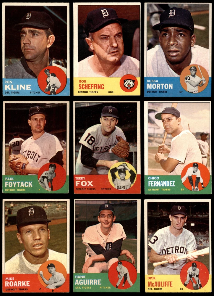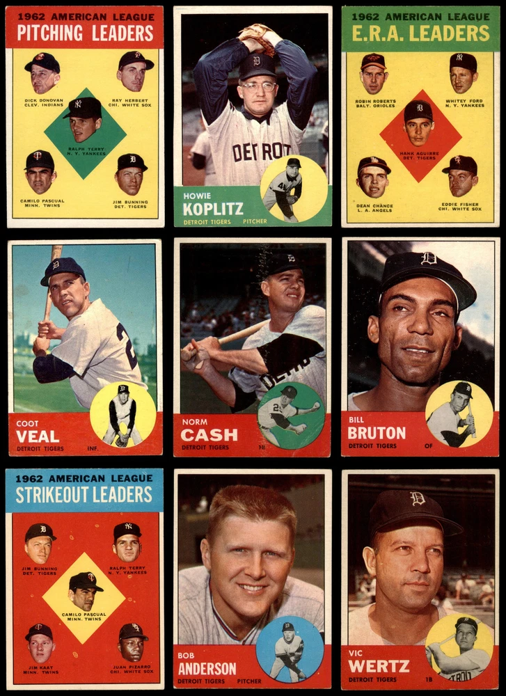 This set contains the following cards 1963 Topps #4 - Harmon Killebrew / Roger Maris / Norm Cash / Rocky Colavito / Jim Gentile / Leon Wagner AL HR Leaders 5 - EX Front Back 1963 Topps #6 - Whitey Ford / Dean Chance / Hank Aguirre / Eddie Fisher / Robin Roberts AL ERA Leaders 3 - VG Front Back 1963 Topps #8 - Jim Bunning / Camilo Pascual / Dick Donovan / Ray Herbert / Ralph Terry AL Pitching Leaders 4 - VG/EX Front Back 1963 Topps #10 - Jim Bunning / Camilo Pascual / Jim Kaat / Juan Pizarro / Ralph Terry AL Strikeout Leaders 4 - VG/EX Front Back 1963 Topps #25 Al Kaline 3 - VG Front Back 1963 Topps #44 Terry Fox 4 - VG/EX Front Back 1963 Topps #64 Dick McAuliffe 4 - VG/EX Front Back 1963 Topps #84 Ron Kline 4 - VG/EX Front Back 1963 Topps #134 Bob Scheffing 4 - VG/EX Front Back 1963 Topps #140 Frank Lary 3 - VG Front Back 1963 Topps #164 Bubba Morton 5 - EX Front Back 1963 Topps #177 Bubba Phillips 4 - VG/EX Front Back 1963 Topps #218 - Jim Bunning / Frank Lary / Don Mossi Tiger Twirlers 3 - VG Front Back 1963 Topps #224 May or may not have black mark just below insert photo Mike Roarke 4 - VG/EX Front Back 1963 Topps #240 Rocky Colavito 4 - VG/EX Front Back 1963 Topps #257 Hank Aguirre 4 - VG/EX Front Back 1963 Topps #278 Chico Fernandez 4 - VG/EX Front Back 1963 Topps #302 Whitey Herzog 3 - VG Front Back 1963 Topps #327 Paul Foytack 3 - VG Front Back 1963 Topps #348 Vic Wertz 4 - VG/EX Front Back 1963 Topps #365 Jim Bunning 4 - VG/EX Front Back 1963 Topps #379 Bob Anderson 4 - VG/EX Front Back 1963 Topps #406 Howie Koplitz 4 - VG/EX Front Back 1963 Topps #437 Billy Bruton 5 - EX Front Back 1963 Topps #445 Ball in Inset Photo can touch or not touch Border Norm Cash 3 - VG Front Back 1963 Topps #453 Jake Wood 4.5 - VG/EX+ Front Back 1963 Topps #466 - Bill Freehan / Tony Martinez / Nate Oliver / Jerry Robinson Rookie Stars 5 - EX Front Back 1963 Topps #475 Gus Triandos 3 - VG Front Back 1963 Topps #494 Phil Regan 4 - VG/EX Front Back 1963 Topps #516 Purnal Goldy 4 - VG/EX Front Back 1963 Topps #530 Don Mossi 3 - VG Front Back 1963 Topps #552 Tigers Team 1.5 - FAIR Front Back 1963 Topps #573 Coot Veal 3 - VG Front Back This is a 1963 Topps Detroit Tigers Team Set. Set breakdown by grade: Number of Cards in Set 33 Average Grade - Weighted by Value 4.06 - VG/EX Average Grade - Unweighted 3.76 - VG/EX Grade Breakdown 5 - EX 4 4.5 - VG/EX+ 1 4 - VG/EX 17 3 - VG 10 1.5 - FAIR 1 The following multi-team rookie cards are omitted, but can be purchased separately:#299 Rookie Stars - Dave Morehead / Tom Butters / Dan Schneider / Bob Dustal, #169 Rookie Stars - Gaylord Perry / Tommie Sisk / Dick Egan / Julio Navarro, #558 Rookie Stars - Ron Hunt / Bill Faul / Al Moran / Bob Lipski and #407 Rookie Stars - Chico Ruiz / Frank Kostro / Larry Elliot / Dick Simpson Dean's Cards offers a 100% Money Back Satisfaction Guarantee on all purchases. Just contact us within 10 days of the purchase date and we will refund your money or, when possible, replace the cards. 1963 Topps Detroit Tigers Team Set 4 - VG/EX 6913975 If the scan in the listing says ACTUAL IMAGE, you will receive the card pictured. For cards issued after 1983, we will often use representative images and you will not receive the exact card pictured. Shipping Policy You only pay shipping on the first item. If you order multiple items on the same order, you will only be charged once for shipping. We do not combine shipping on multiple orders. To avoid multiple shipping charges we recommend using eBay's "Add to Cart" feature to check out multiple items in one transaction, or please request and allow for us to send an invoice to reflect the combined shipping charges. Canadian customers - We send all of our Canadian/International packages with tracking and cannot make any exceptions to this policy. Negotiating Prices All prices are final and we do not negotiate. This policy is to ensure that everyone knows that they are getting our best possible price. So please do not ask us to negotiate on price. Return Policy Dean's Cards has a 100% Money Back Satisfaction Guarantee on all purchases, as long as the product is returned within 30 days of receiving the product. Card Grading Each card is first reviewed by a member of our team, in order to detect any flaws that may not be visible on a scan, such as wrinkles, creases, print spots, or light stains. The vast majority of our vintage cards are professionally graded by the Dean's Cards Grading Software and include a 100% satisfaction guarantee. Our grading is on par with PSA standards when it comes to corners, centering and flaws - and tends to grade a bit tougher than PSA, on cards with a tilted image or rough edges. This grading software was developed to provide far better grading and consistency than can be achieved using the human eye. Determining the card's grade The sharpness of the corners and the degree to which a card was cut off-center determines the maximum possible grade that the card can receive. The card's grade is further reduced by any flaws or blemishes that it may have. Each card is evaluated on the following characteristics and assigned a score. Corners - Each corner of a card is individually analyzed, and then assigned a score on how square, sharp, and flawless it appears. Centering - The borders are measured, at multiple points along the edge, to determine the horizontal and vertical centering and tilt. Defects - The card is examined for imperfections, such as: size, print flaws, dings, stains, creases, or other wear which could lower its grade. Bonus for Perfect Centering - A vintage card, with near perfect centering, is given a one-half grade bonus. So when you buy one of our cards with a half-grade (e.g. 3.5 or 6.5) it will appear perfectly centered, both vertically and horizontally. Grading Criteria Worst Corner - A card can grade only as high as the worst corner will allow. Average Corner Tilt - The difference in width of a card border near the top, compared to the bottom. OCT - The 