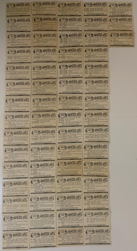 Step back into the chilling world of 1960s monster madness with this rare complete 1963 Topps Monster Laffs Midgee full set —both Series 1 and the tough Series 2 high numbers! Featuring all 153 cards (#1-#153), these pocket-sized vintage non-sport trading cards (measuring just 40mm x 64mm) deliver classic black-and-white photos of iconic horror creatures and B-movie scenes, paired with hilarious gag captions on the fronts and groan-worthy "Monster Laffs" jokes on the backs. Originally issued in perforated 3-card panels (here carefully separated into singles), this expanded set captures the peak of goofy, spooky 1960s monster fun with many images reused and expanded from Topps' standard-size series. The low numbers (#1-108) are more common, but the scarce high numbers (#109-153, just 45 cards) make full completion a true challenge—highly sought-after and rarely found together in strong grade. Overall Excellent or better condition, with a few slightly lesser—retaining that genuine vintage appeal without heavy wear. Please examine the photos carefully—you'll receive the exact set pictured. This full 153-card masterpiece is one of the toughest 1960s monster sets to assemble complete in high grade! A prized treasure for any horror trading card collector! Manufacturer: Topps, 1963 Condition: Overall Excellent or better condition, with a few lesser. Examine photos carefully – this is the exact set you will receive. View pictures closely Check out our other Monster Movie Magazines and Cards listed! Shop TvMovieCards – sci-fi, horror, TV – all in stock!