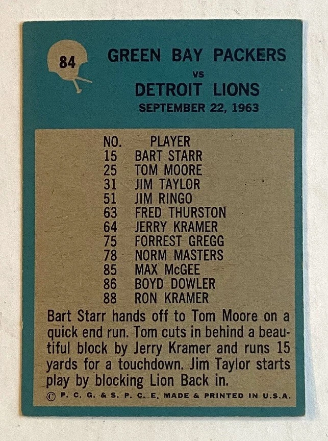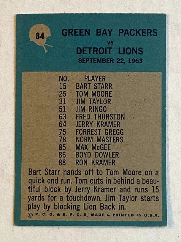 1964 Philadelphia Football Star ~ #84 Green Bay Packers vs Detroit Lions ~ ExMINT ~ Please view the photos for centering and sharpness. *** Don't Forget to check out our ebay store "" Gridiron Football Greats "" for More Quality Old Cards & RARE Collectibles at Fantastic prices!!!!!