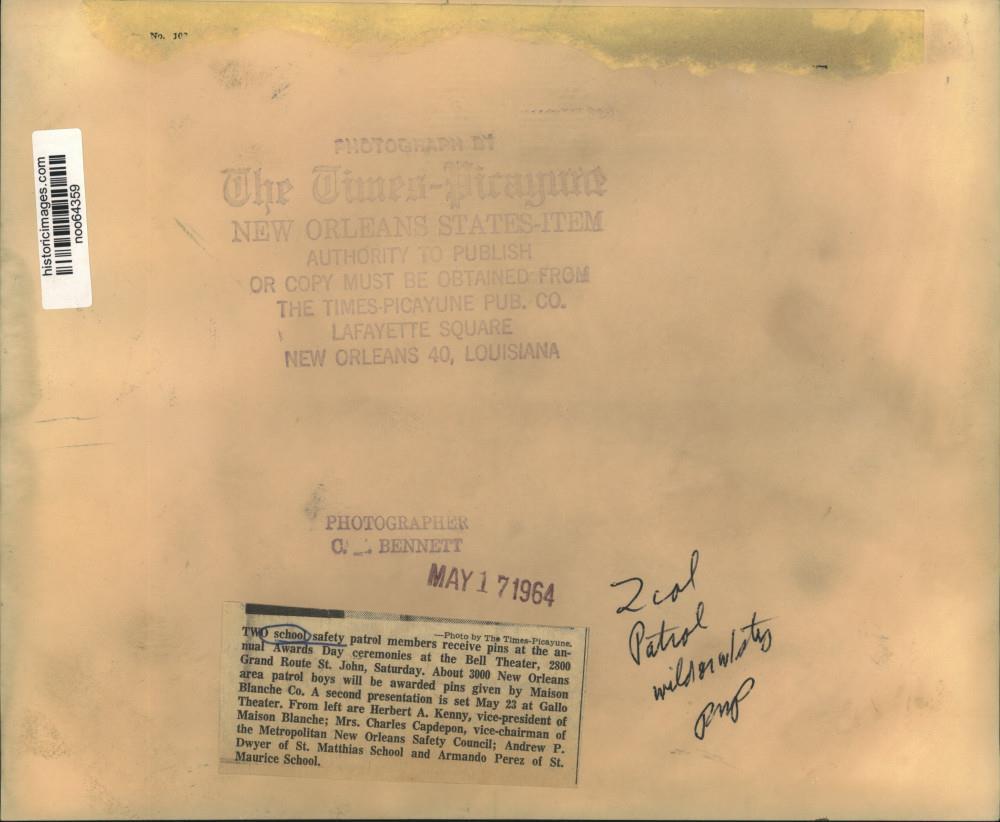 ebay template Note: Please study the images carefully to determine the condition of this vintage photograph, as it may not be in perfect condition. It may contain wrinkles, cracks, and possibly even tears due to its age and how it was handled before it got to us. A scanner may interpret colors and contrast differently than human eyes will, so it is possible that the actual photograph may be slightly darker or lighter in person. This vintage photograph is offered for sale as a collectible item and conveys no transfer of copyright. 1964 Press Photo School Safety Patrol Members Given Pins at Awards Day Ceremony This is an original press photo. Two school safety patrol members receive pins at the annual Awards Day ceremonies at the Bell Theater, 2800 Grand Route St. John, Saturday. About 3000 New Orleans area patrol boys will be awarded pins given by Maison Blanche Company. A second presentation is set May 23 at Gallo Theater. From left are Herbert A. Kenny, vice-president of Maison Blanche; Mrs. Charles Capdepon, vice-chairman of the Metropolitan New Orleans Safety Council; Andrew P. Dwyer of St. Matthias School and Armando Perez of St. Maurice School. Photo measures 10 x 8.25 inches. Photo is dated 05-17-1964. PHOTO FRONT PHOTO BACK Historic Images Part Number: noo64359 Sell Smarter with Kyozou. Inventory and Ecommerce Management