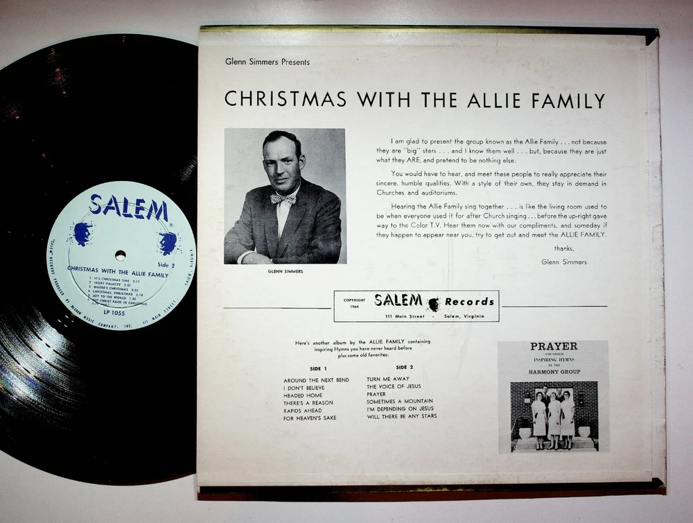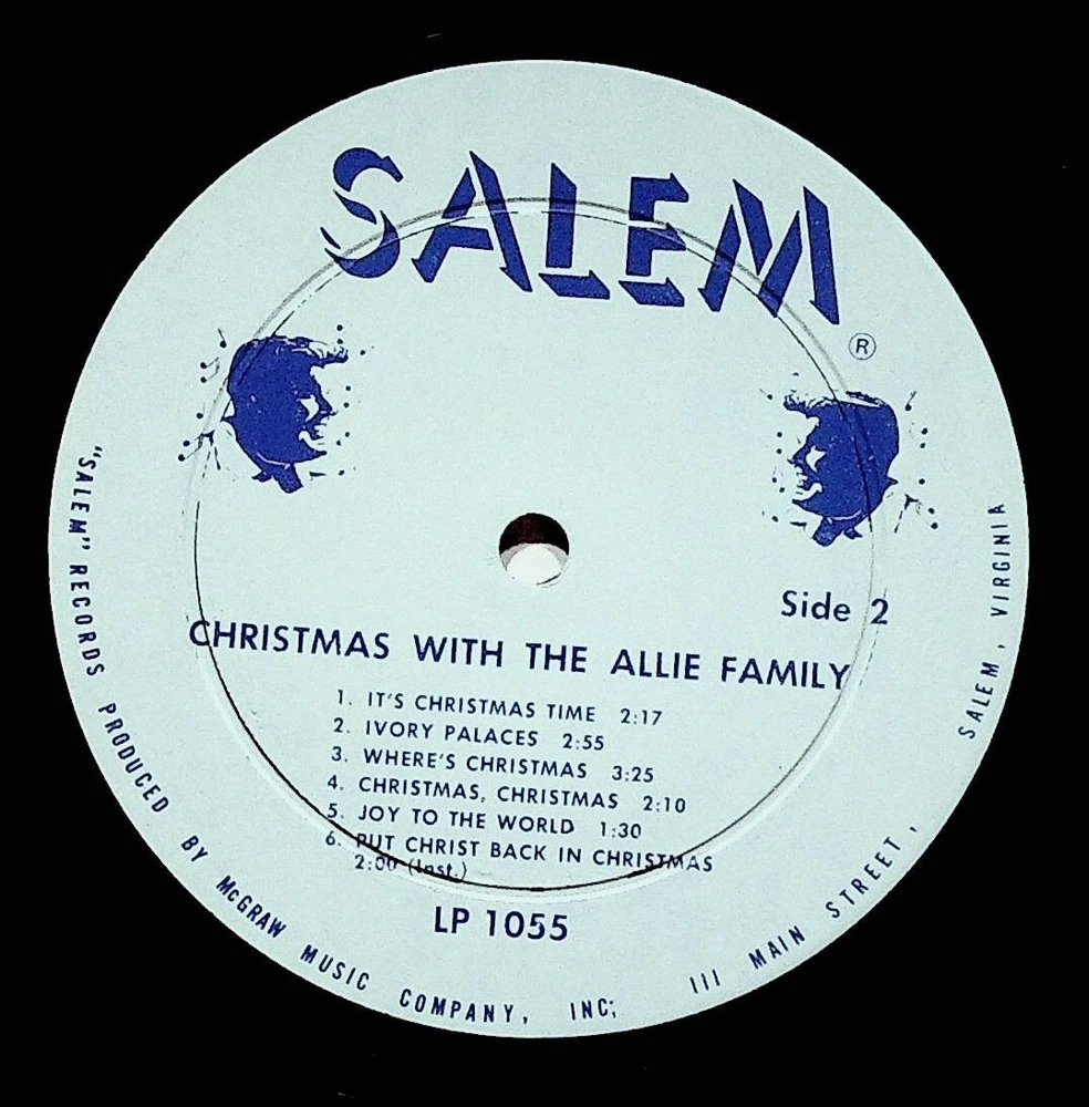 Yes we combine shipping for multiple purchases. Add multiple items to your cart and the combined shipping total will automatically be calculated. 1964 Salem VA Virginia Christmas With The Allie Family Christian Vinyl LP Record VG+ Record Grade per Goldmine Standard: VG+ SIDE 1 AROUND THE NEXT BEND I DON'T BELIEVE HEADED HOME THERE'S A REASON RAPIDS AHEAD FOR HEAVEN'S SAKE SIDE 2 TURN ME AWAY THE VOICE OF JESUS PRAYER SOMETIMES A MOUNTAIN I'M DEPENDING ON JESUS WILL THERE BE ANY STARS I am glad to present the group known as the Allie Family . . . not because they are big stars . . . and I know them well . . . but, because they are just what they ARE, and pretend to be nothing else. You would have to hear, and meet these people to really appreciate their sincere, humble qualities. With a style of their own, they stay in demand in Churches and auditoriums. Hearing the Allie Family sing together ... is like the living room used to be when everyone used it for after Church singing . . . before the up-right gave way to the Color T.V. Hear them now with our compliments, and someday if they happen to appear near you, try to get out and meet the ALLIE FAMILY. thanks, Glenn Simmers lp3074