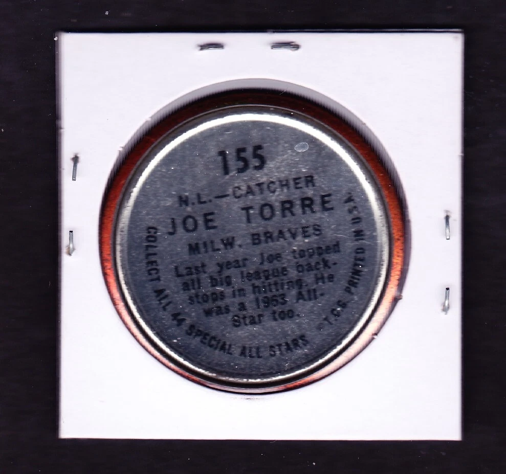 1964 TOPPS COINS #155 JOE TORRE BRAVES. COIN WILL BE SHIPPED IN PADDED ENVELOPE WITH DELIVERY CONFIRMATION. FREE SHIPPING. Inventory #180608