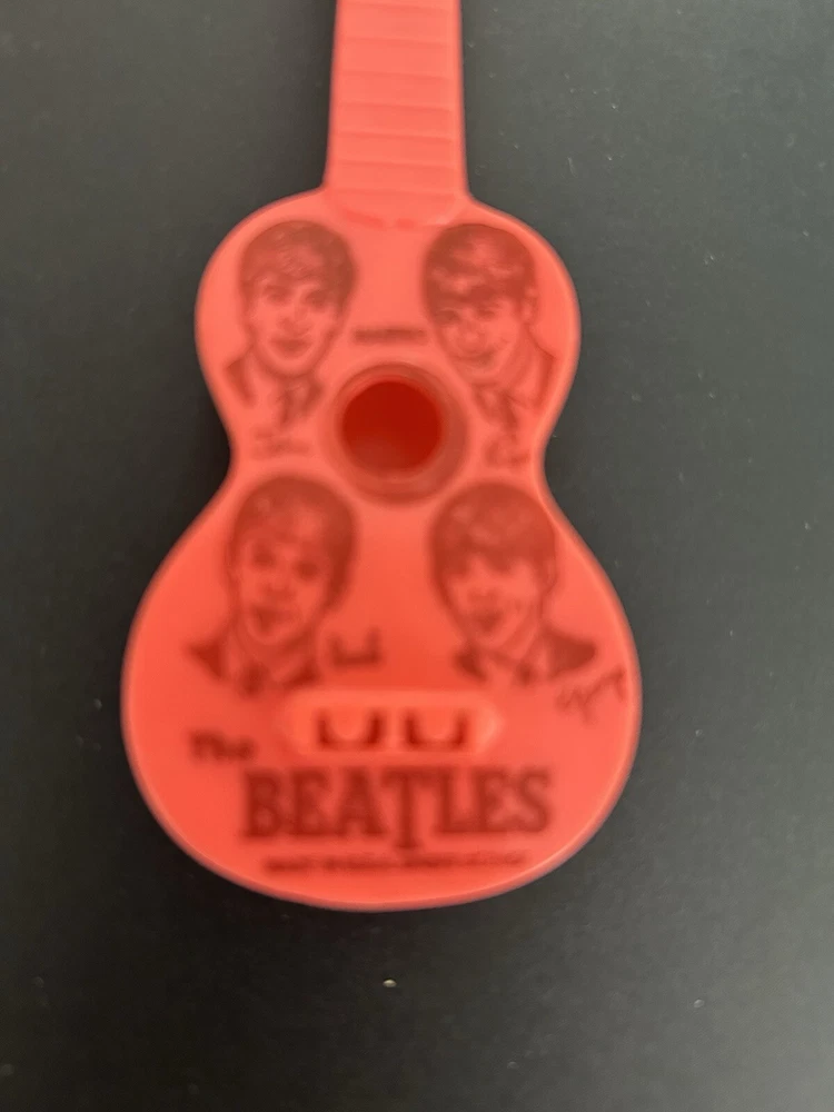 Rare Vintage Beatles Guitar Toy 1964 Approx.5 inches long. A very cool hard to find little guitar and in great condition. Please look at the pictures ask any questions The 5 inch plastic guitar has a clip on the back you can clip to your lapel or pocket. I have had these over the years and they never came with strings. This is an original vintage from 1964 era. Selling “As Is” NO RETURNS Made in U.S.A. Under License. Any questions please message me