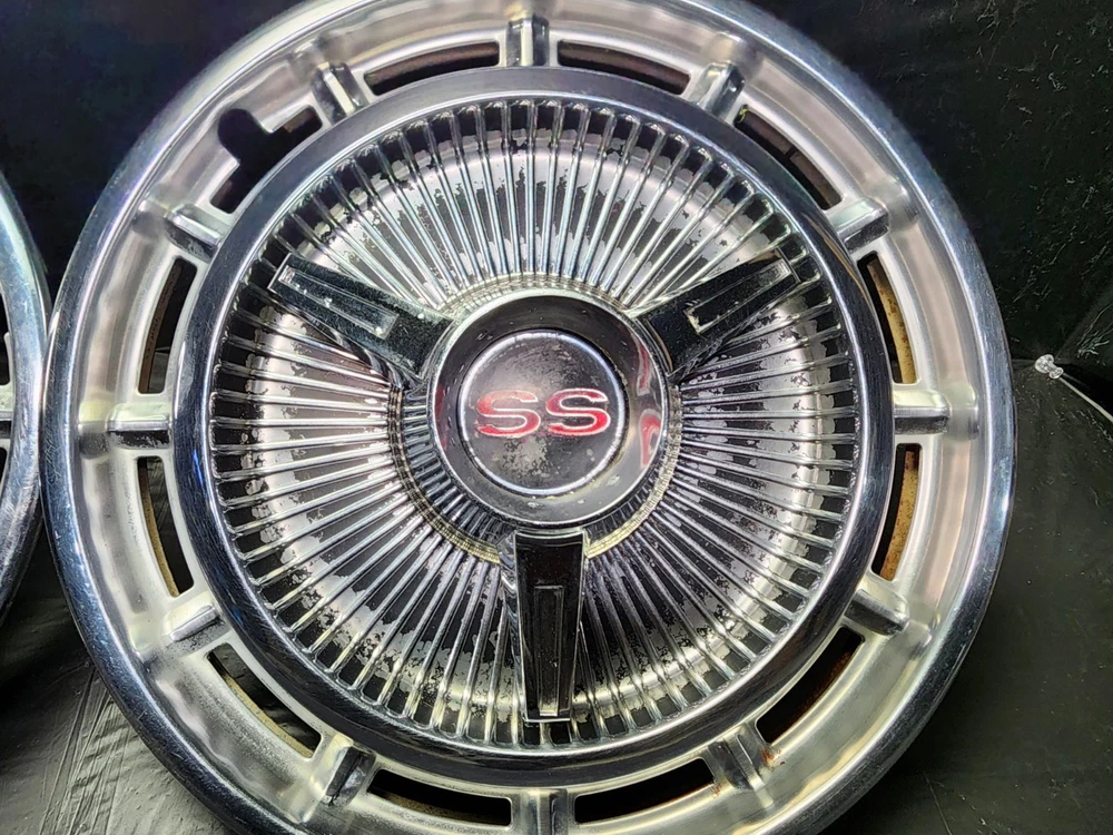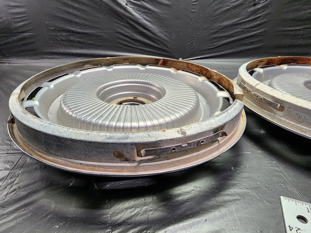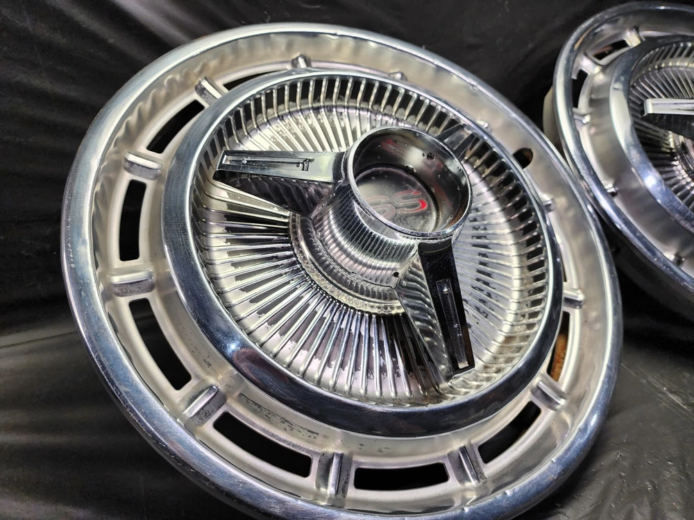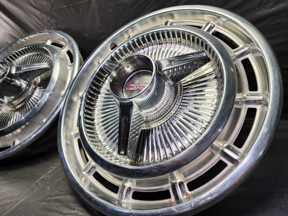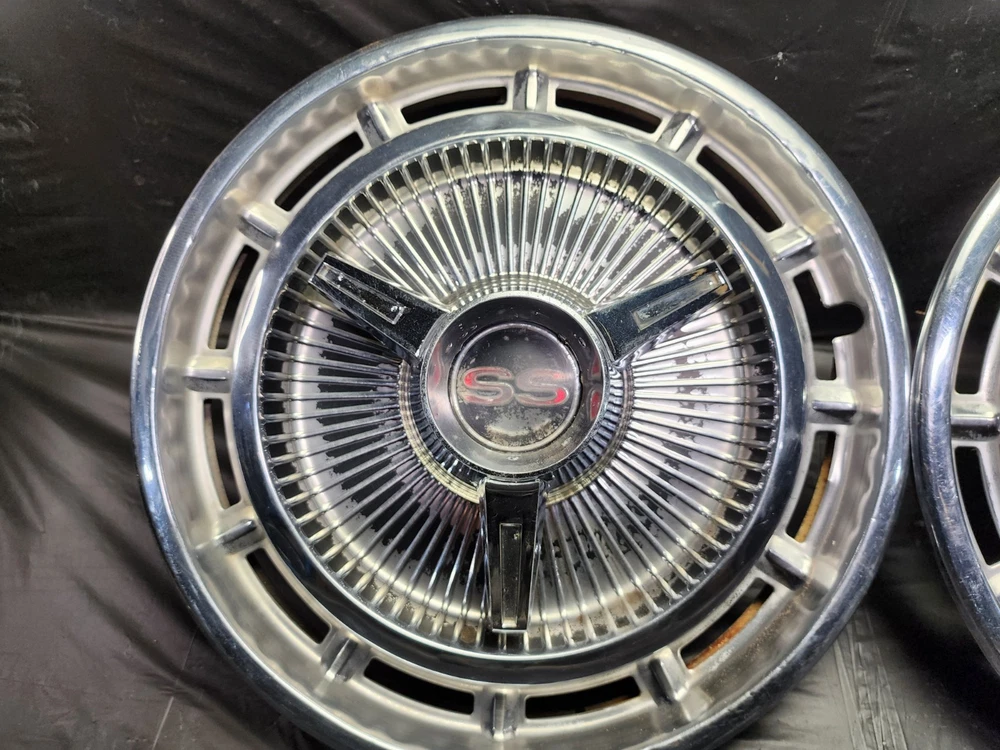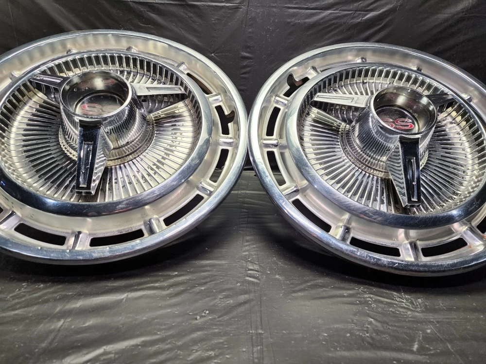 Vintage 40s 50s 60s 70s hub caps. nice pair of 60s Chevy Impala Original OEM Factory OE hubcaps wheel covers center caps. in good condition considering their age and being used. These are Used hubcaps off of old classic cars that were driven on the road and used, so please see photos for complete condition as they are not all perfect. Most have some fading, dings, scuffing, mineral staining, etc could use a good polishing to bring em back to full shine, but otherwise in beautiful condition. Check out more of my ebay page as we are going through and listing a ton of classic / vintage hubcaps from the the 20's 30's 40's 50's 60's 70's 80's 90's 00's and up. all different makes and models such as Ford Chevy Chevrolet GM Cadillac GMC camero nova Chevelle Nomad Bel Air Mercury Corvette Mustang Oldsmobile Pontiac Lincoln Dodge Plymouth Buick Chrysler Mopar Fairlane Volkswagen Cheiftain Challanger Charger 1500 4x4 muscle car hot rod rat rod Cars and Trucks 15in 14in 16in and so much more from full sets to sets of 2 and singles, you name it check us out!