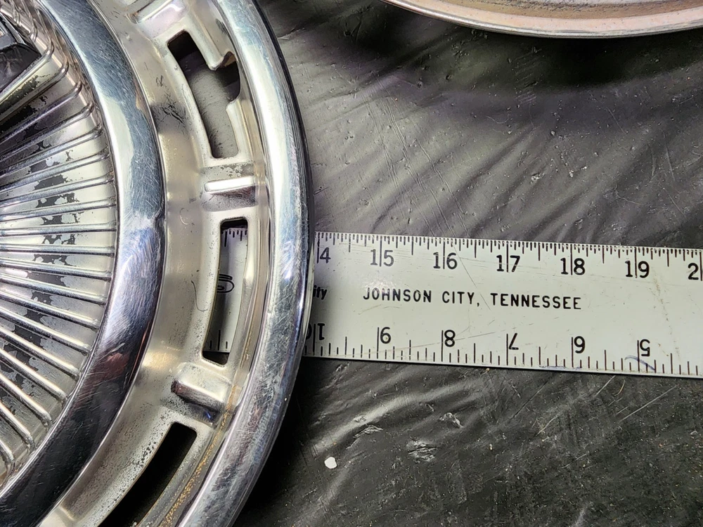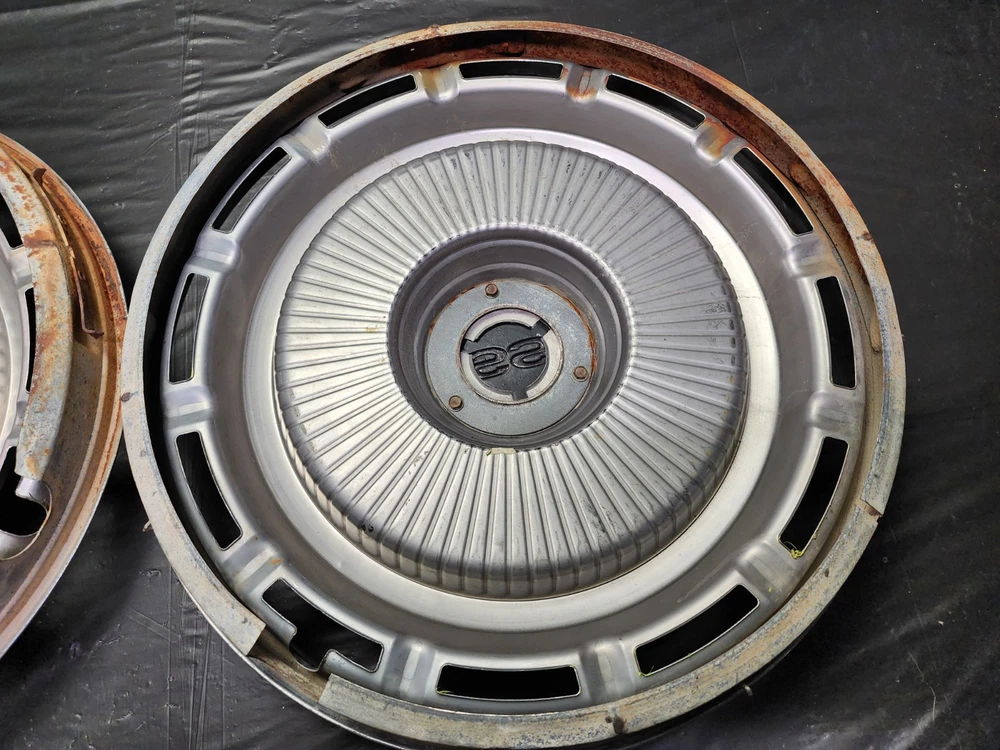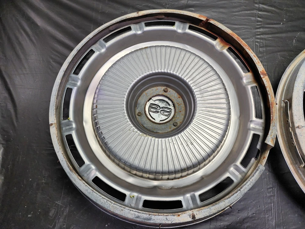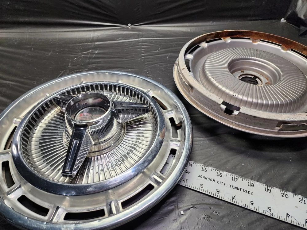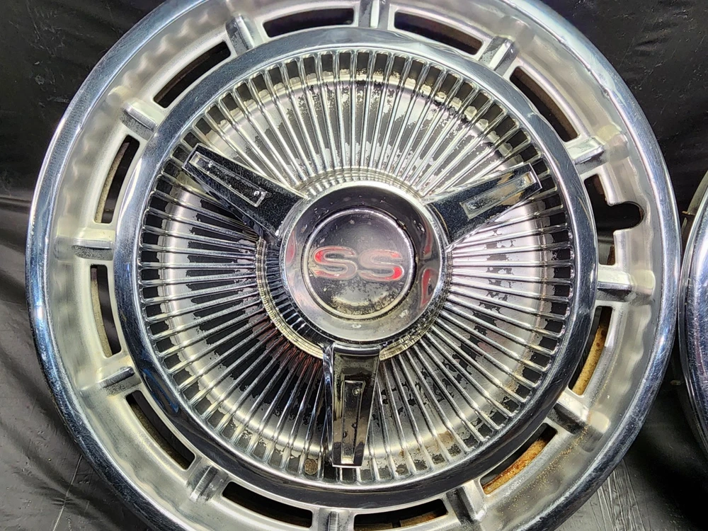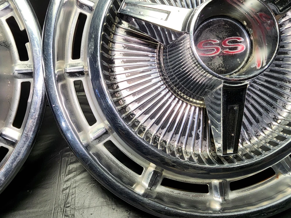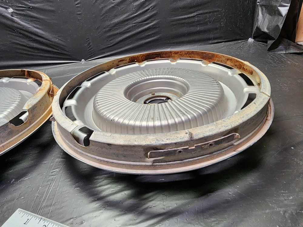Vintage 40s 50s 60s 70s hub caps. nice pair of 60s Chevy Impala Original OEM Factory OE hubcaps wheel covers center caps. in good condition considering their age and being used. These are Used hubcaps off of old classic cars that were driven on the road and used, so please see photos for complete condition as they are not all perfect. Most have some fading, dings, scuffing, mineral staining, etc could use a good polishing to bring em back to full shine, but otherwise in beautiful condition. Check out more of my ebay page as we are going through and listing a ton of classic / vintage hubcaps from the the 20's 30's 40's 50's 60's 70's 80's 90's 00's and up. all different makes and models such as Ford Chevy Chevrolet GM Cadillac GMC camero nova Chevelle Nomad Bel Air Mercury Corvette Mustang Oldsmobile Pontiac Lincoln Dodge Plymouth Buick Chrysler Mopar Fairlane Volkswagen Cheiftain Challanger Charger 1500 4x4 muscle car hot rod rat rod Cars and Trucks 15in 14in 16in and so much more from full sets to sets of 2 and singles, you name it check us out!