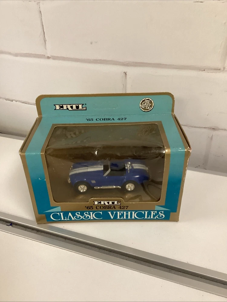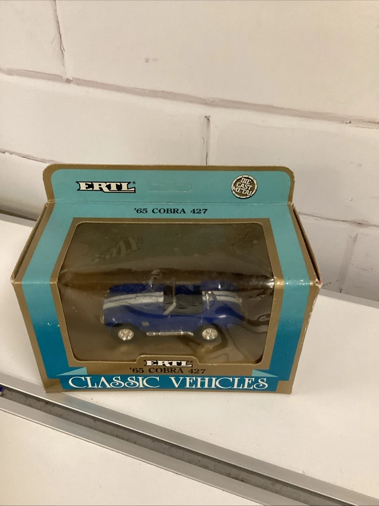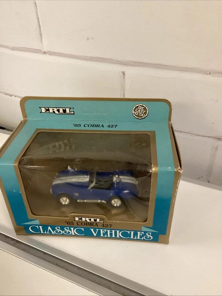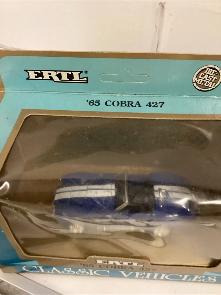 The product is a die-cast metal model of a 1965 Cobra 427 Convertible produced by Ertl. This toy car accurately represents the classic Cobra model with its sleek design and convertible top. As a collectible item in the Toys & Hobbies category, this die-cast vehicle appeals to car enthusiasts and collectors who appreciate detailed replicas of iconic cars like the Cobra 427.