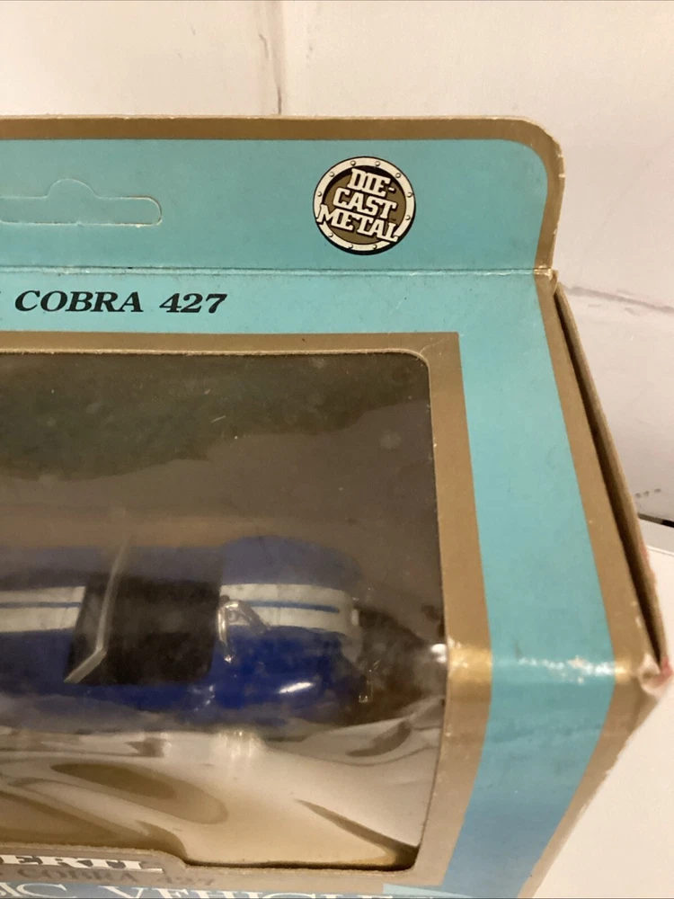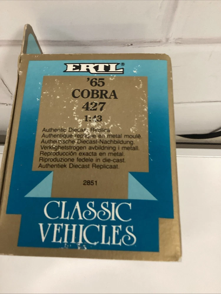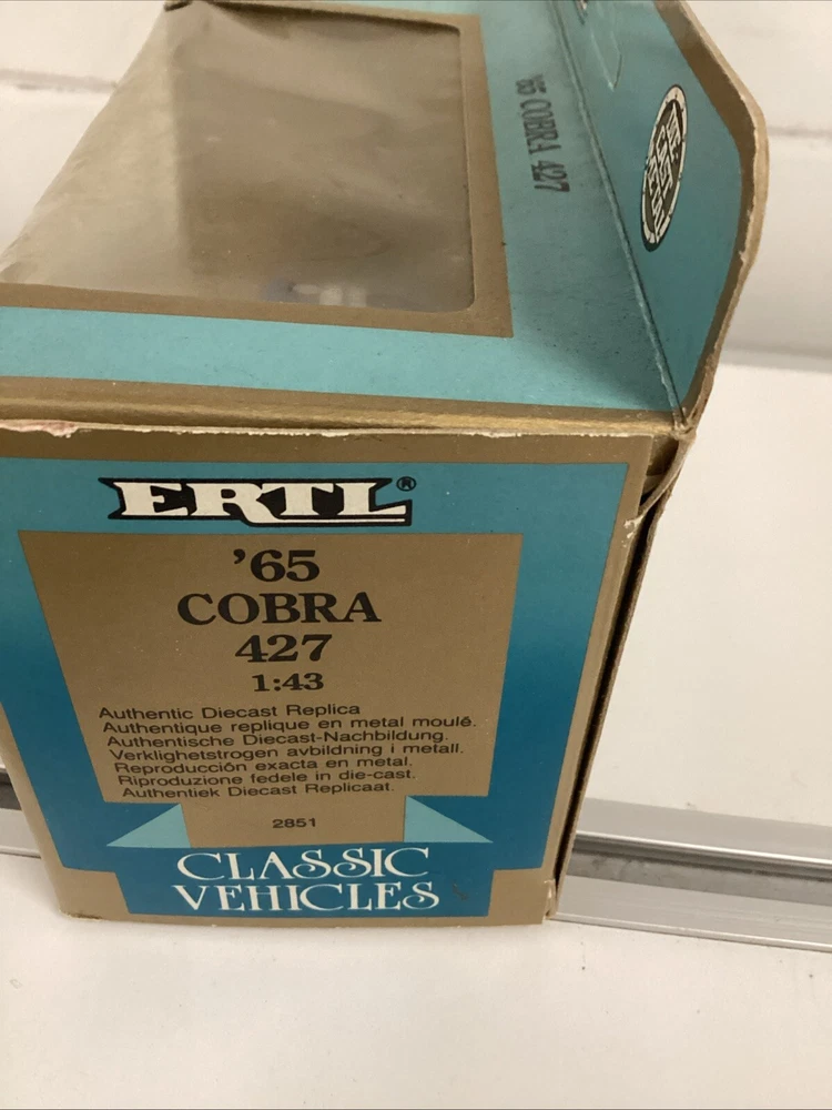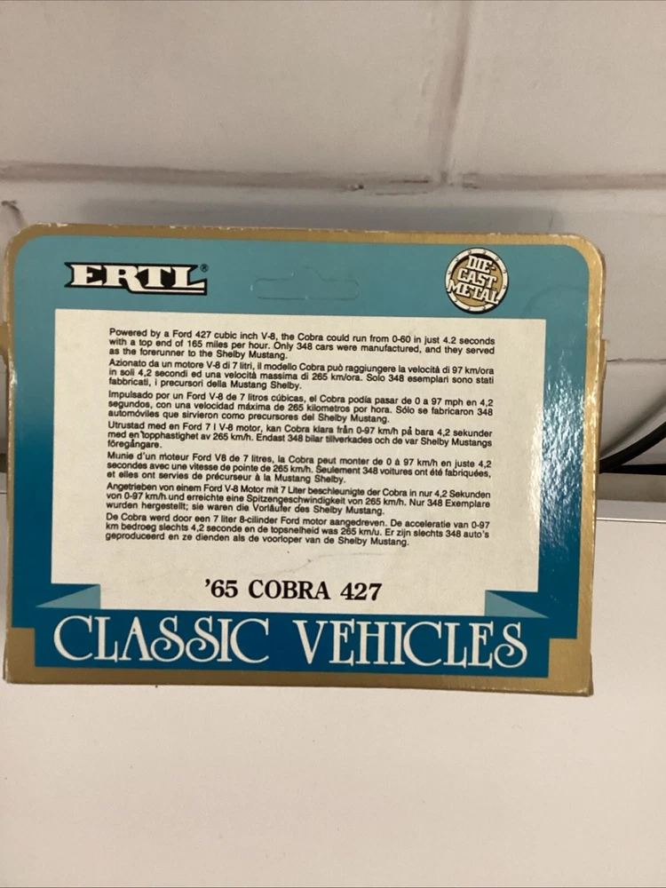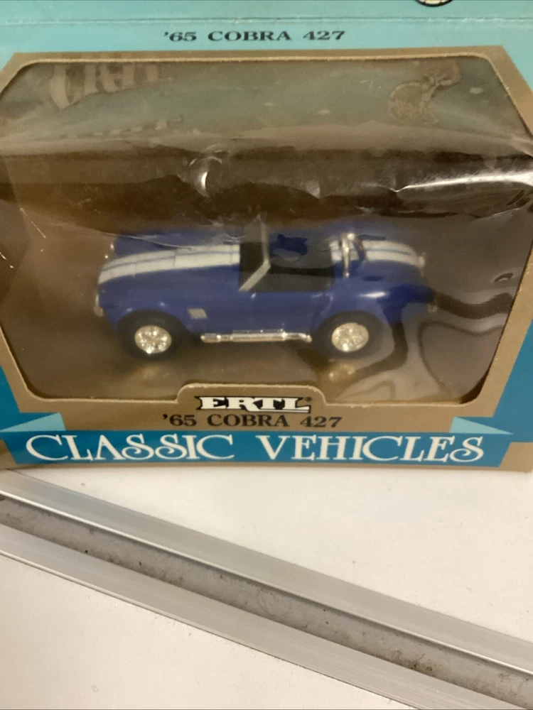 The product is a die-cast metal model of a 1965 Cobra 427 Convertible produced by Ertl. This toy car accurately represents the classic Cobra model with its sleek design and convertible top. As a collectible item in the Toys & Hobbies category, this die-cast vehicle appeals to car enthusiasts and collectors who appreciate detailed replicas of iconic cars like the Cobra 427.